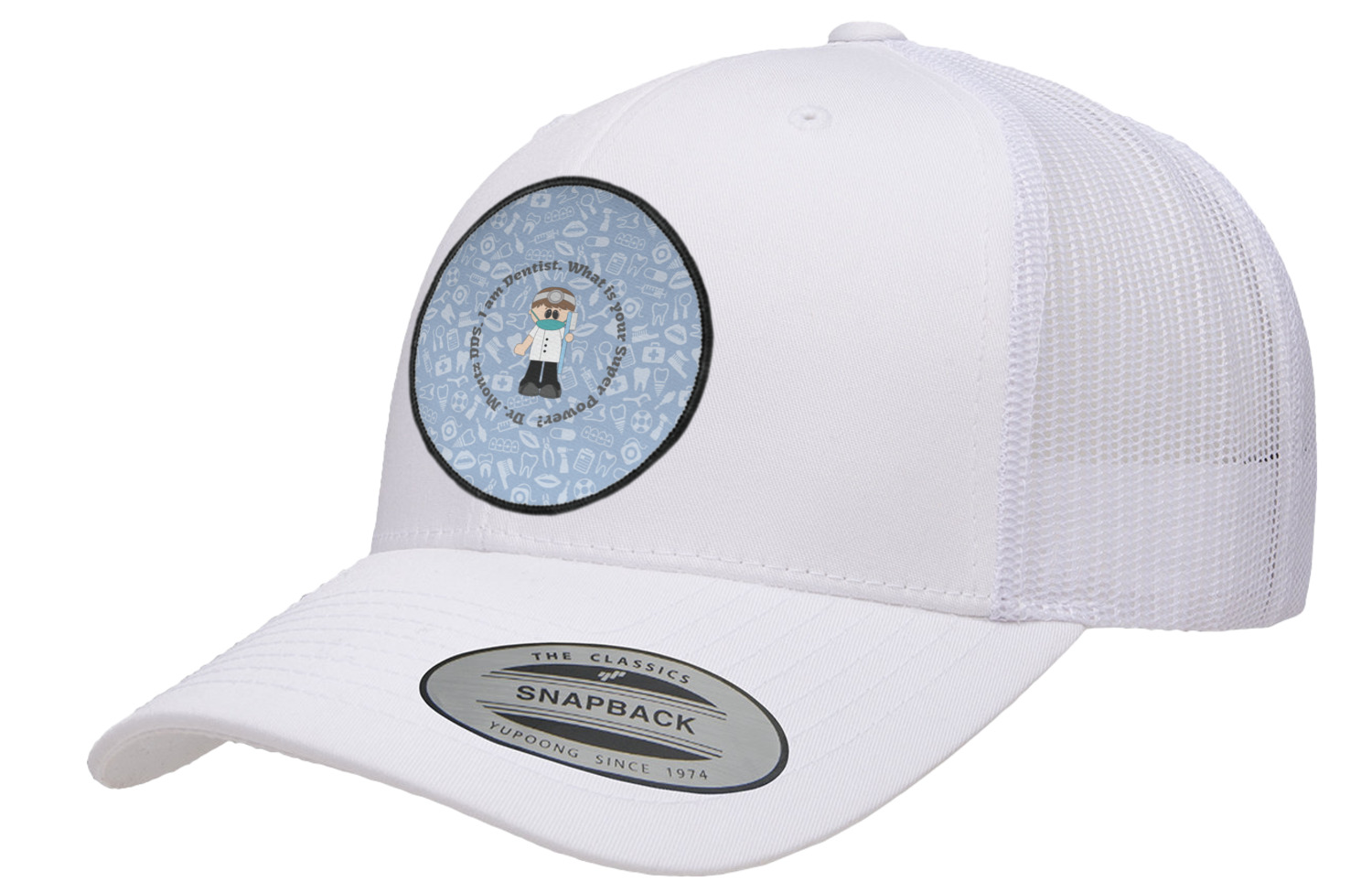 This design is a light blue with dark blue accents in its background. The design features a fun little cartoon dentist that will just make you smile. The text surrounding the little dentist will be the perfect place for a dentist pun or your name!