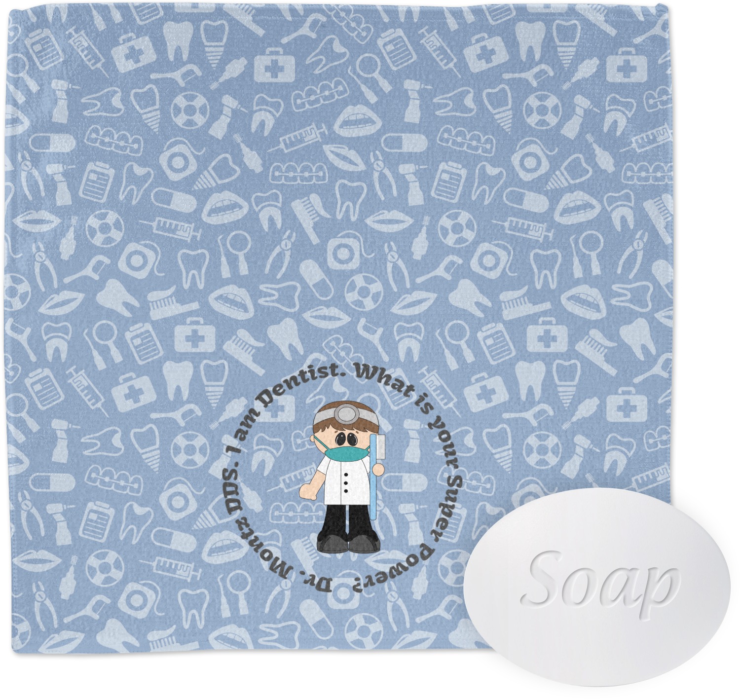 This design is a light blue with dark blue accents in its background. The design features a fun little cartoon dentist that will just make you smile. The text surrounding the little dentist will be the perfect place for a dentist pun or your name!