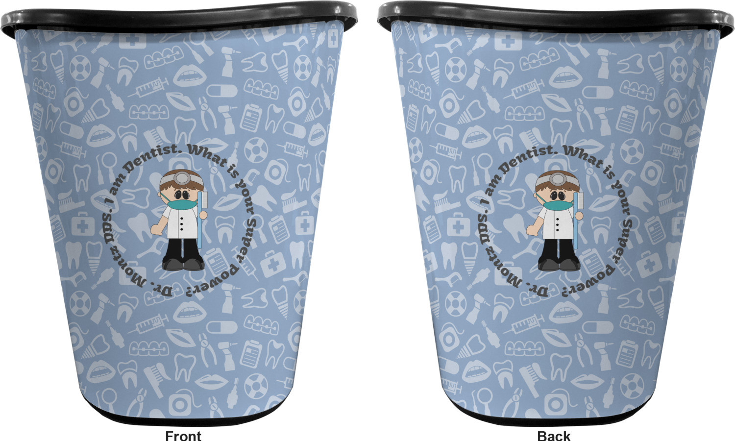 This design is a light blue with dark blue accents in its background. The design features a fun little cartoon dentist that will just make you smile. The text surrounding the little dentist will be the perfect place for a dentist pun or your name!