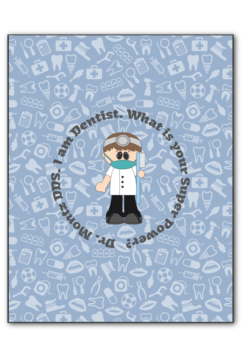 This design is a light blue with dark blue accents in its background. The design features a fun little cartoon dentist that will just make you smile. The text surrounding the little dentist will be the perfect place for a dentist pun or your name!