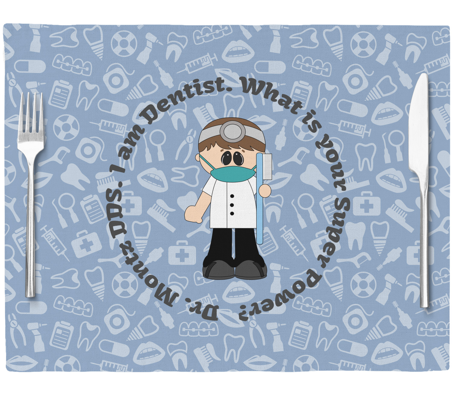 This design is a light blue with dark blue accents in its background. The design features a fun little cartoon dentist that will just make you smile. The text surrounding the little dentist will be the perfect place for a dentist pun or your name!