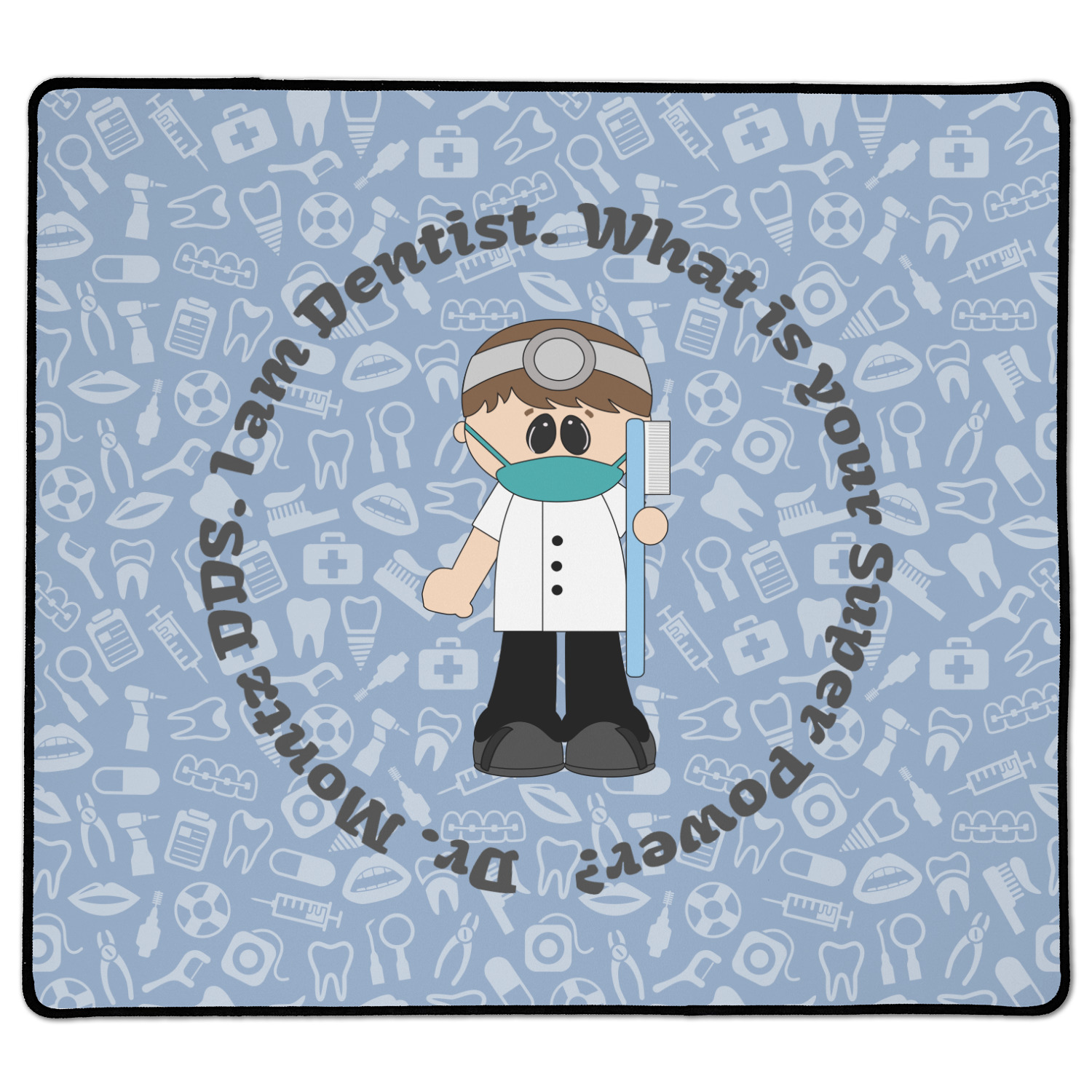 This design is a light blue with dark blue accents in its background. The design features a fun little cartoon dentist that will just make you smile. The text surrounding the little dentist will be the perfect place for a dentist pun or your name!
