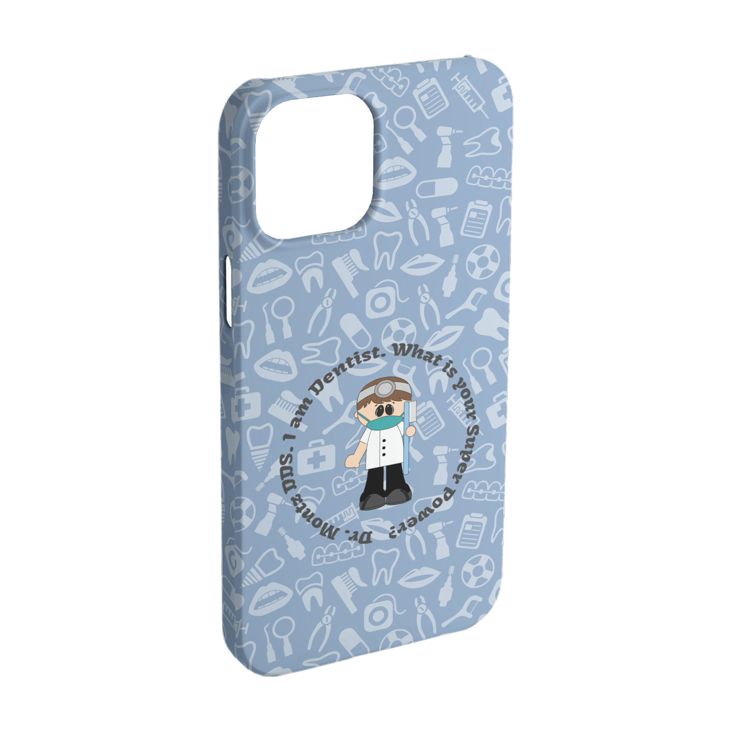 This design is a light blue with dark blue accents in its background. The design features a fun little cartoon dentist that will just make you smile. The text surrounding the little dentist will be the perfect place for a dentist pun or your name!