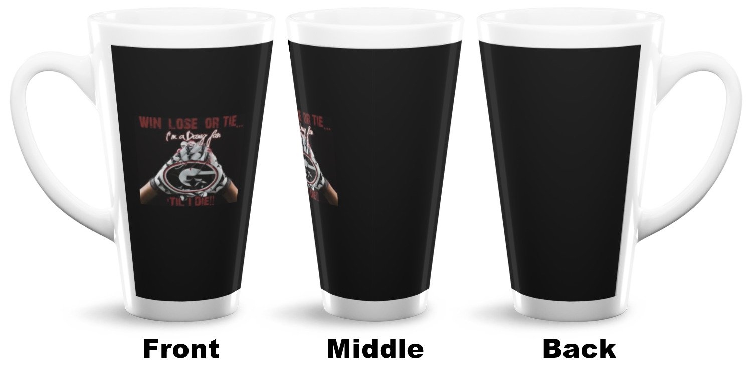 Choose from one of our two ceramic latte mug sizes. Our 12oz latte cups are great for a few shots of espresso or some tea before bed. The 16oz mug is a tall latte mug perfect to hold iced coffee or give you extra room to sip your favorite drink. We print your design with a glossy finish wrapping around the outside of the ceramic mug, so make sure your design is displayed to your ideal vision!