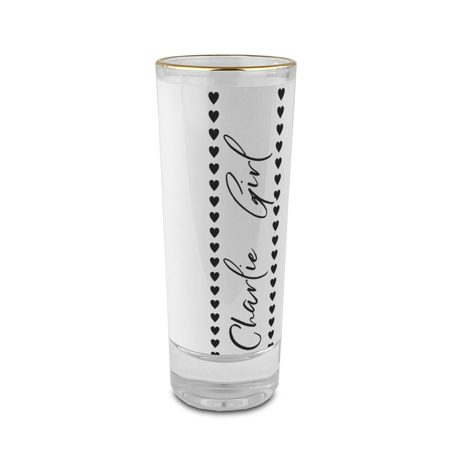 These glass shooter glasses are printed in full color with the design of your choice. These are a tall shooter 2 oz size and stand 4" tall. The print is a full wrap design to boldly display your personalization.