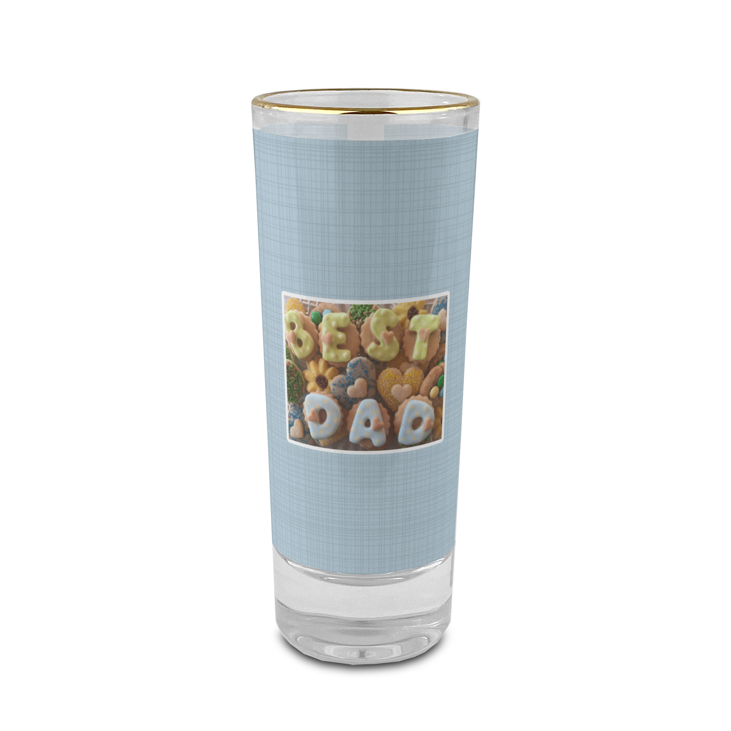 These glass shooter glasses are printed in full color with the design of your choice. These are a tall shooter 2 oz size and stand 4" tall. The print is a full wrap design to boldly display your personalization.
