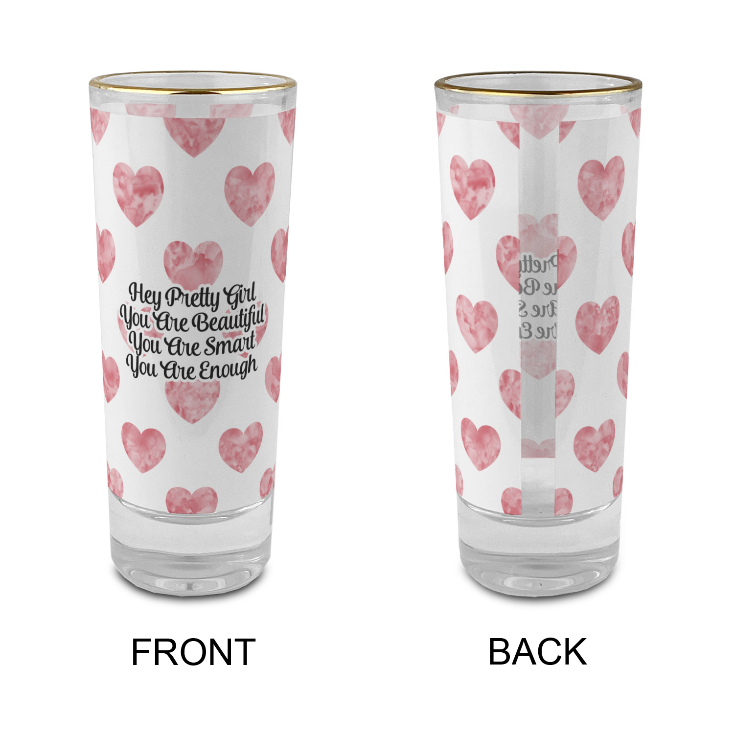 These glass shooter glasses are printed in full color with the design of your choice. These are a tall shooter 2 oz size and stand 4" tall. The print is a full wrap design to boldly display your personalization.