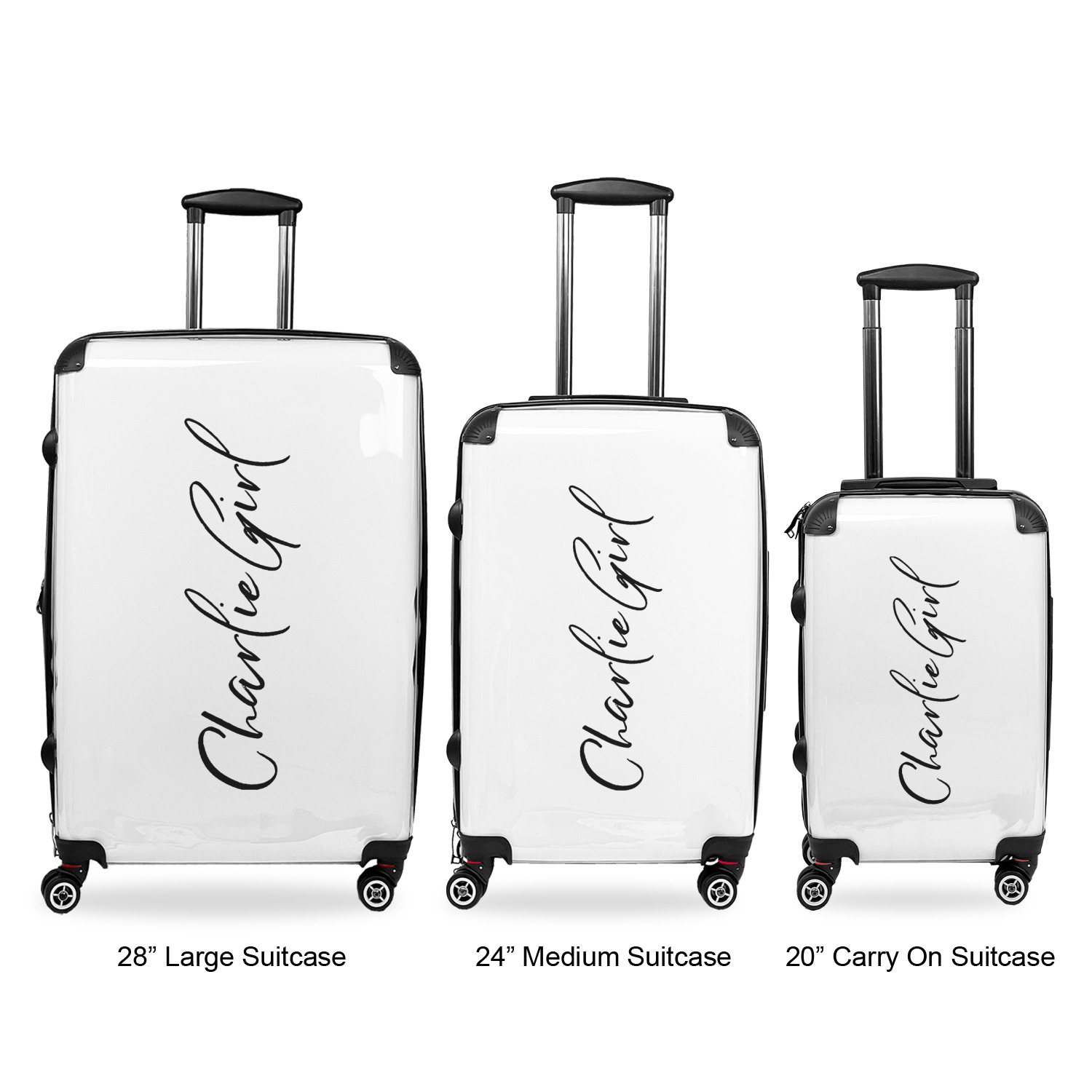Your suitcases will be personalized on the front, while the back and sides are a sleek charcoal color. On the side opposite of the side handle there are rubber feet to allow it to safely lay on its side on a luggage belt. These are a lightweight hard shell luggage option that will fit just about anyone's needs. The sizes and weights of each suitcase are below: