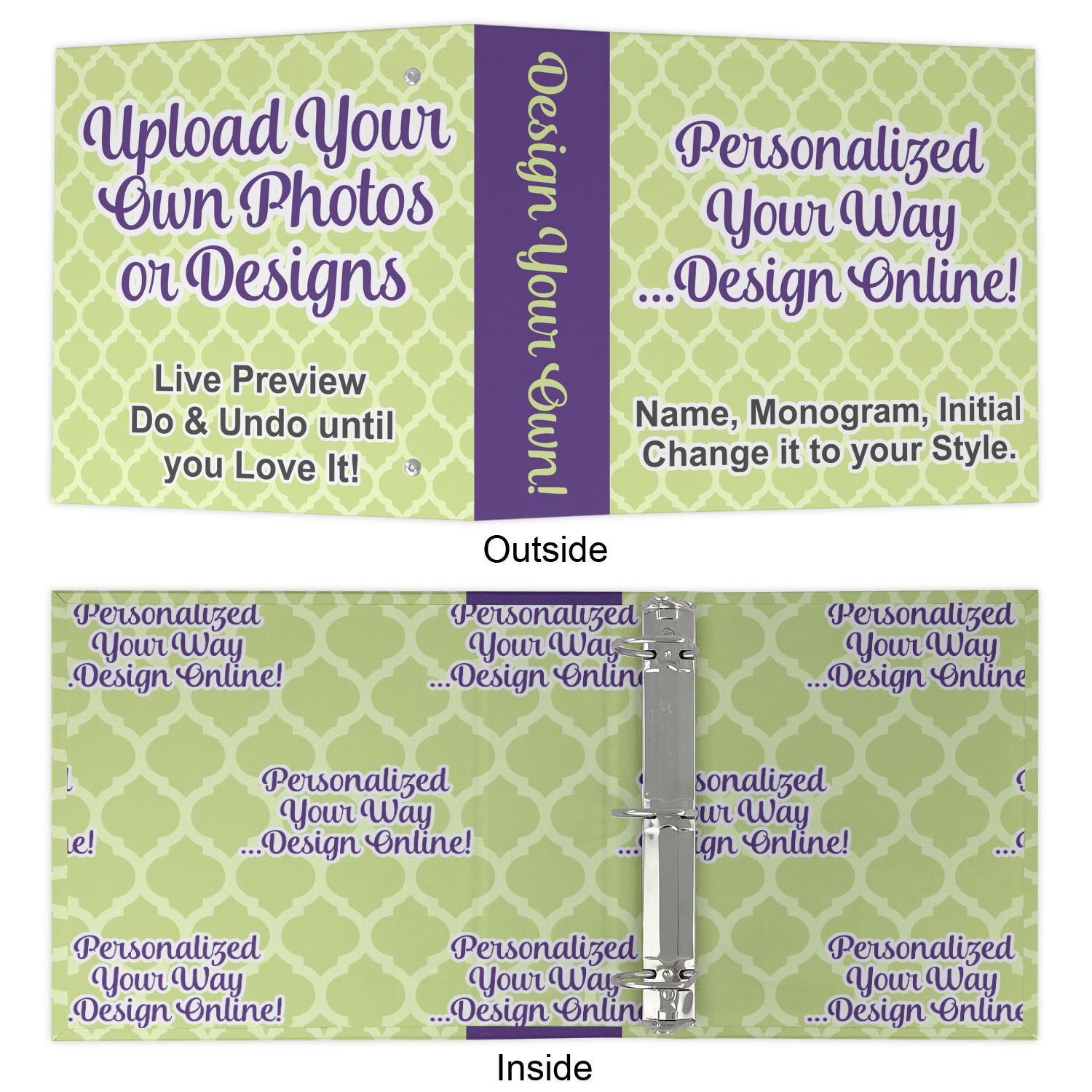 Made from a sturdy cardboard base with a full high quality canvas textured vinyl wrap with the design of your choice. Unlike our standard 3-ring binder with the full wrap design your artwork wraps from the front and back and into the inside of the binder.