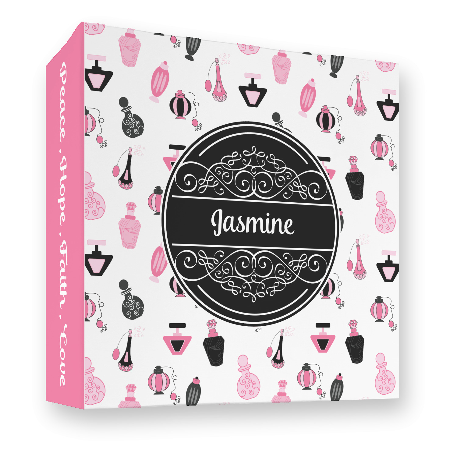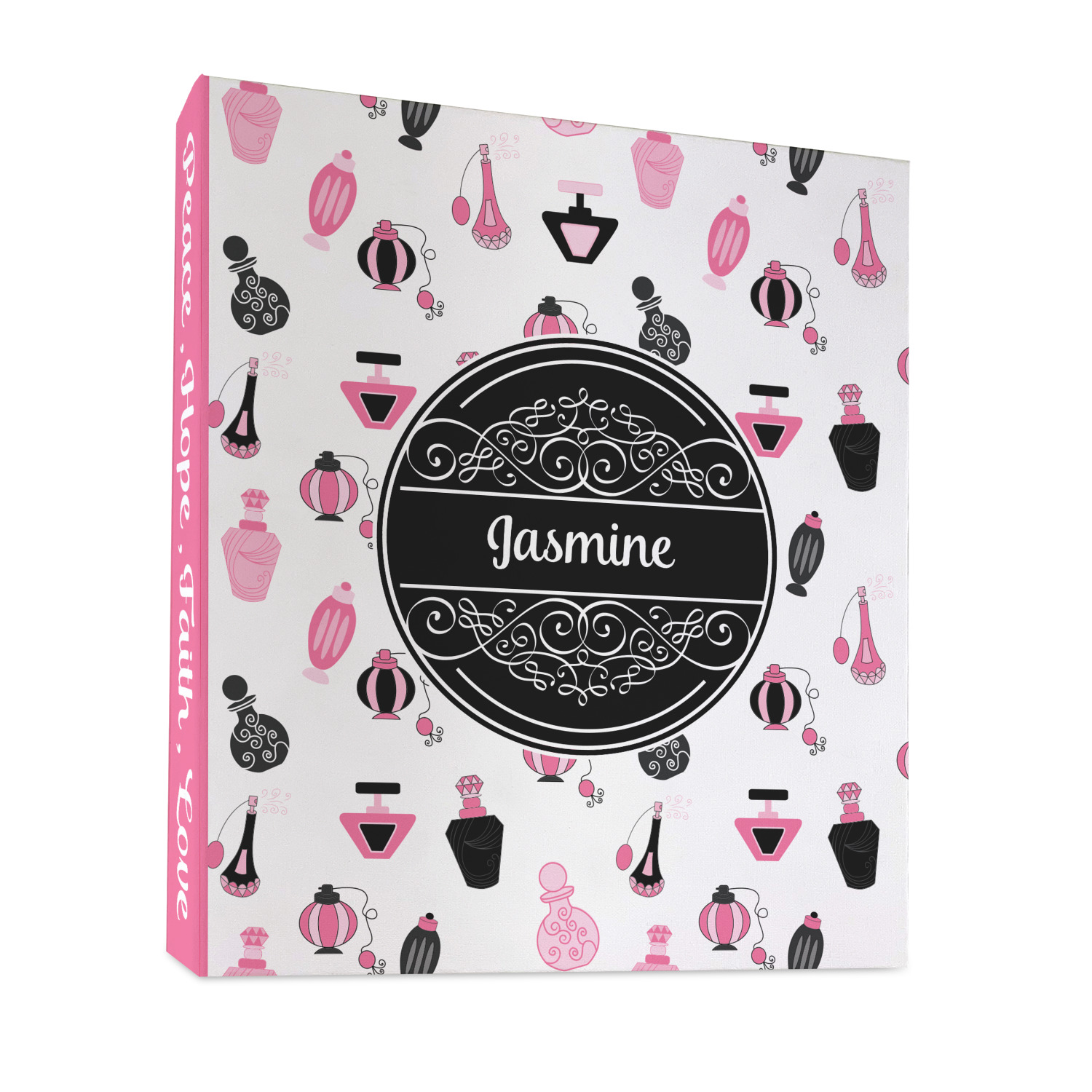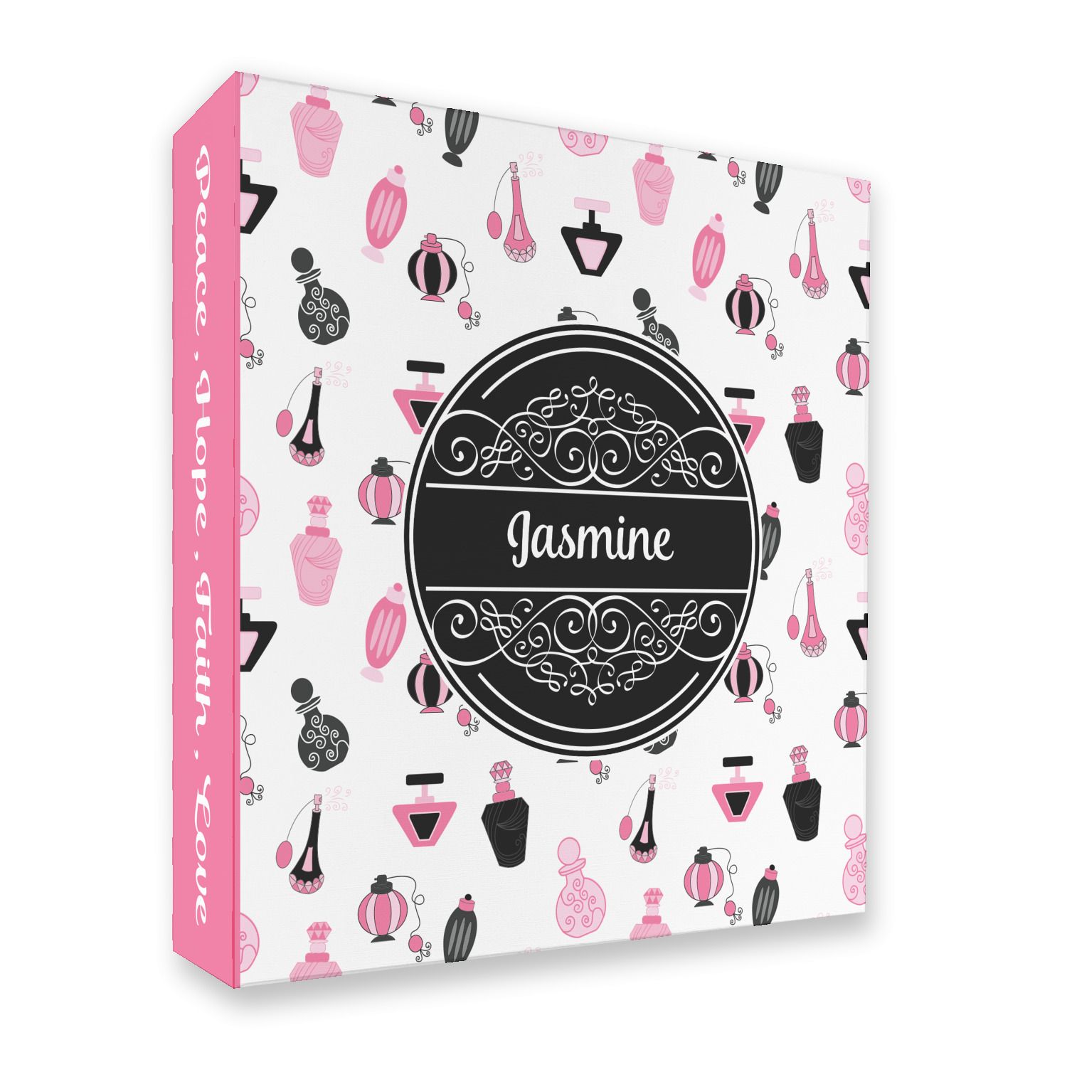 Made from a sturdy cardboard base with a full high quality canvas textured vinyl wrap with the design of your choice. Unlike our standard 3-ring binder with the full wrap design your artwork wraps from the front and back and into the inside of the binder.