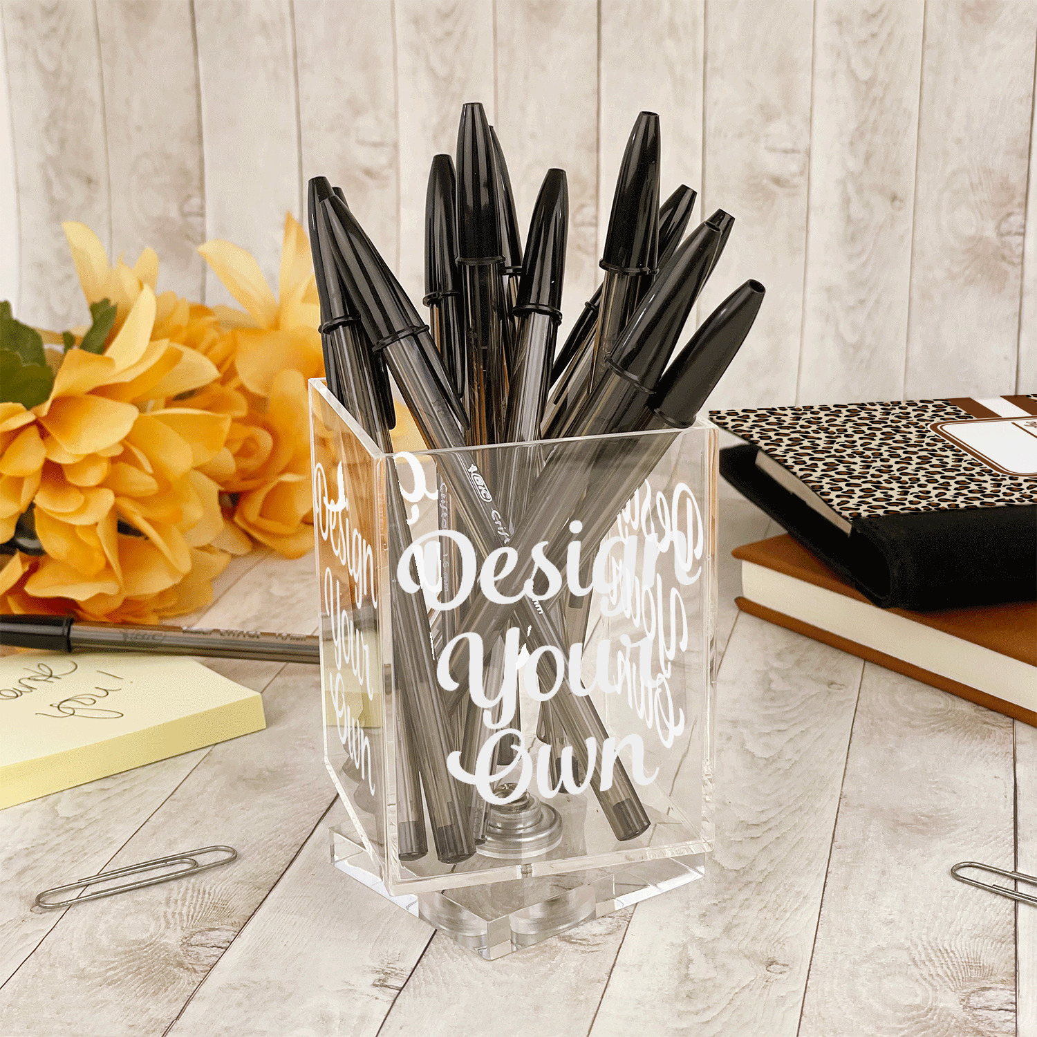 Add a great accessory to your desk with one of these acrylic pen holders. A great way to store your writing utensils, and personalized to suit your needs.