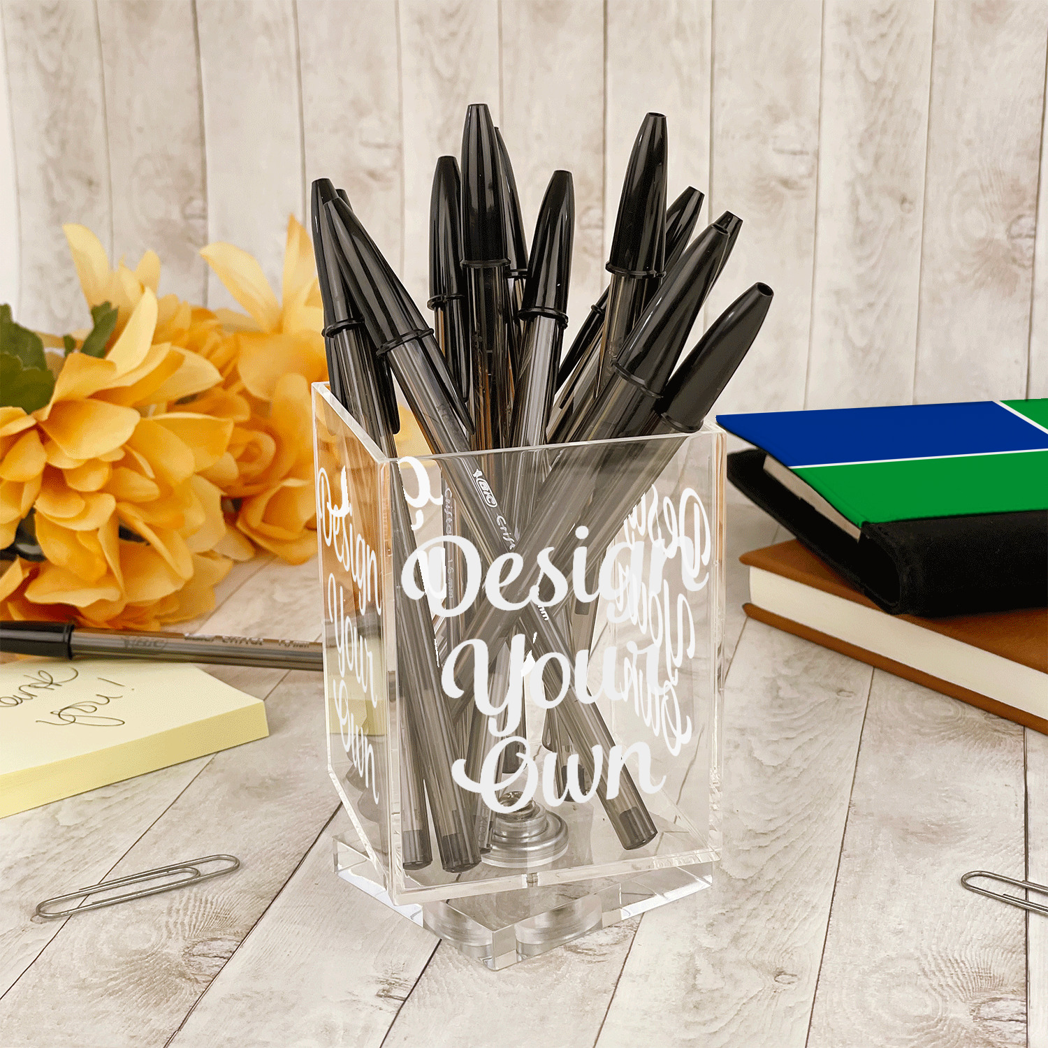 Add a great accessory to your desk with one of these acrylic pen holders. A great way to store your writing utensils, and personalized to suit your needs.