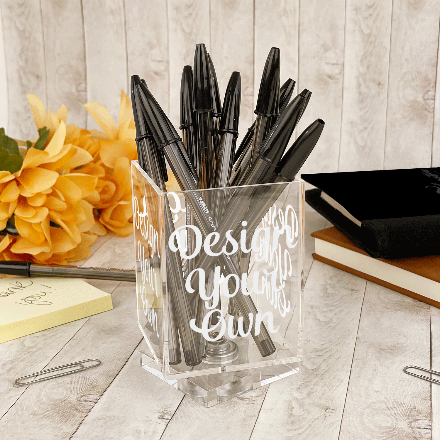 Add a great accessory to your desk with one of these acrylic pen holders. A great way to store your writing utensils, and personalized to suit your needs.