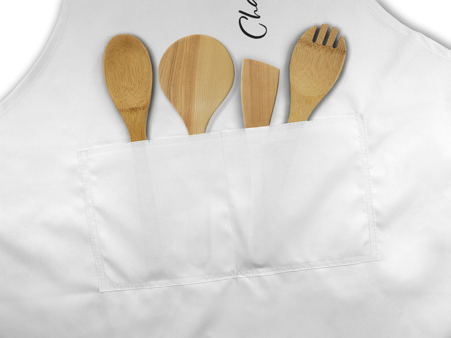 Our aprons are a lightweight yet durable polyester material. We offer two styles of aprons, one without pockets and one with two pockets adorning the center near the waistline. Each apron is one size* and comes with adjustable straps for both the neckline and waist. We print your custom design on the front of the apron to display your creativity!