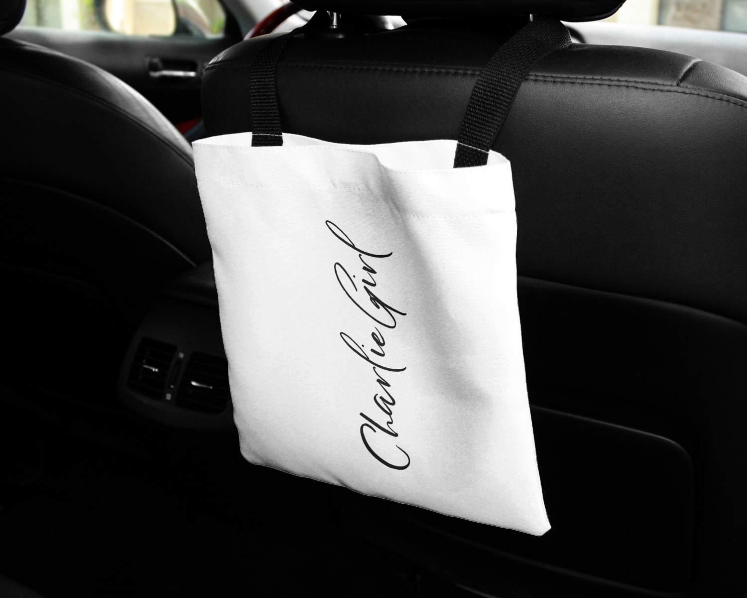 These car back seat organizers are sturdy tote-like bags, fabricated from a robust polyester, and features a single handle on the back side. The strap features an attachable velcro for easy attachment to headrests, grocery carts, car seats, and more. Simply undo the velcro, loop the strap around the headrest, reattach the velcro, and let the organizer hang from the front seat. These car organizers are the perfect means of increasing your backseat's legroom, while storing multiple items in one place for better accessibility. Each car back seat organizer measures at 10 by 10 inches, and features your personalized design printed across its front and back.