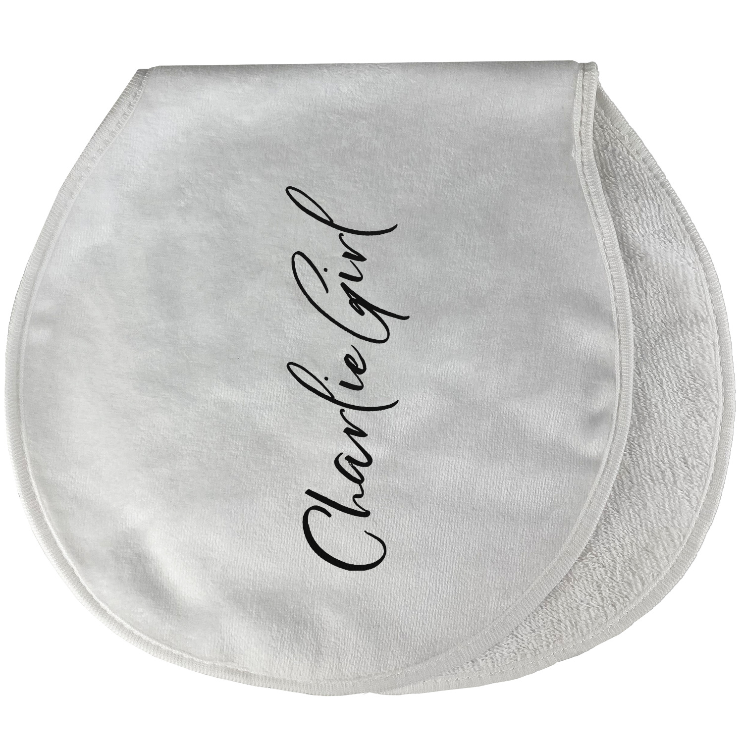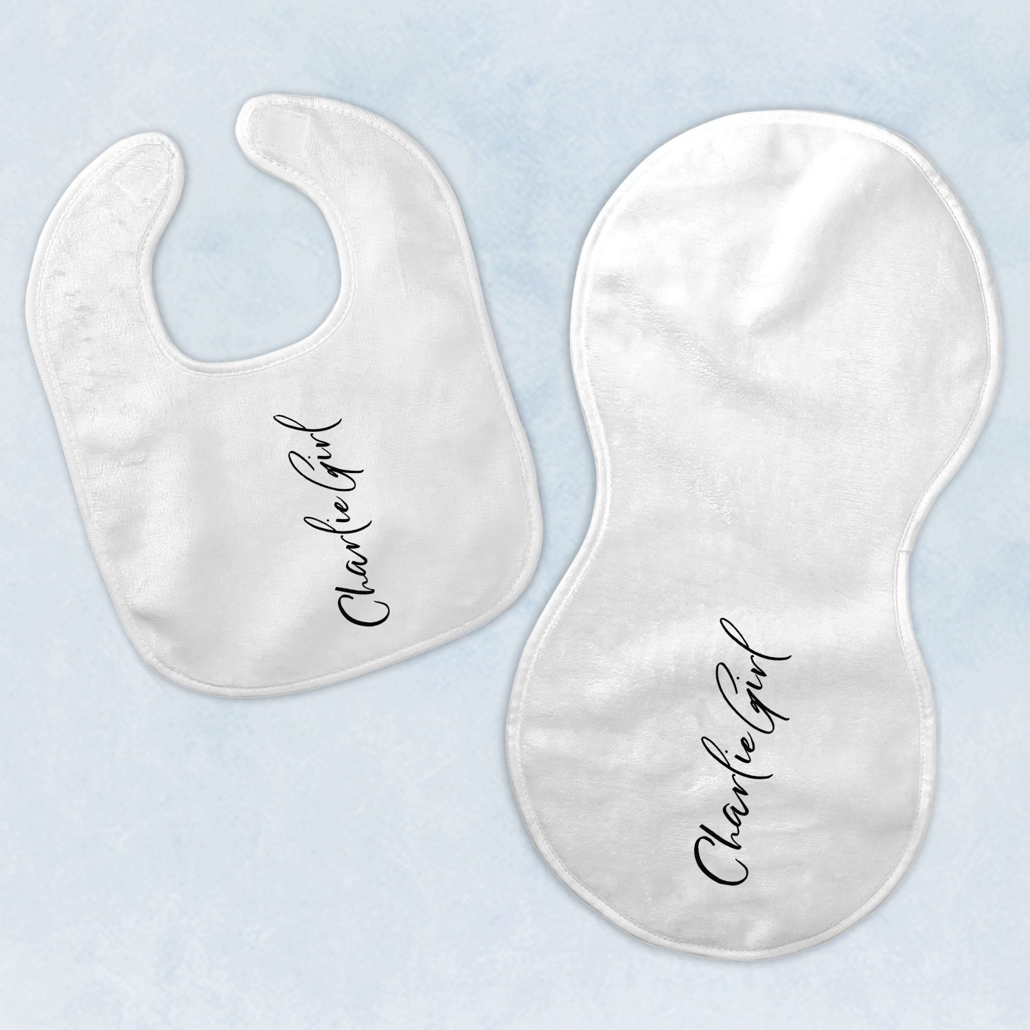 Both our baby bib and burp pad are made up of soft, microfiber velour with a cotton backing. The comfortable and plush material of our bib and burp set is perfect for both baby and parent. We print your design on the microfiber velour face fabric with baby safe ink on your customizable bib and burp cloth to ensure safety for the little one! Our drool bib also comes with a Velcro clasp for safe and easy wear while the burp cloth is a unique peanut shape that perfectly hugs over the shoulder.