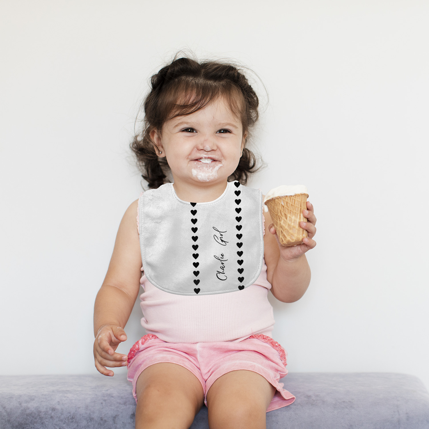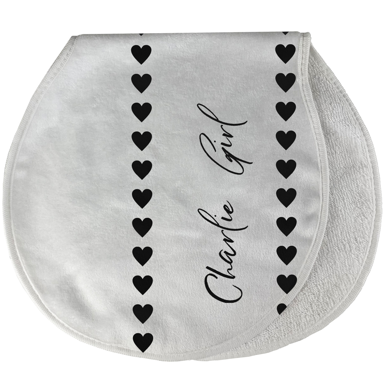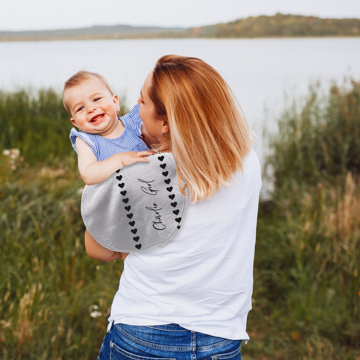 Both our baby bib and burp pad are made up of soft, microfiber velour with a cotton backing. The comfortable and plush material of our bib and burp set is perfect for both baby and parent. We print your design on the microfiber velour face fabric with baby safe ink on your customizable bib and burp cloth to ensure safety for the little one! Our drool bib also comes with a Velcro clasp for safe and easy wear while the burp cloth is a unique peanut shape that perfectly hugs over the shoulder.