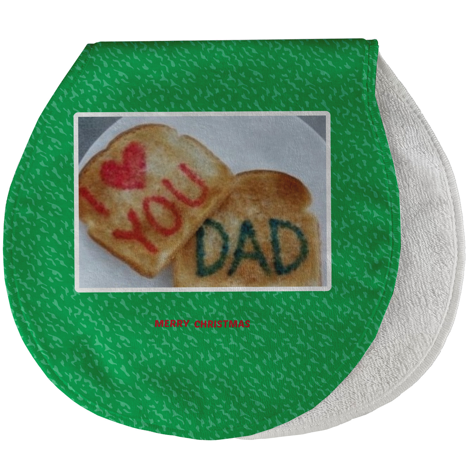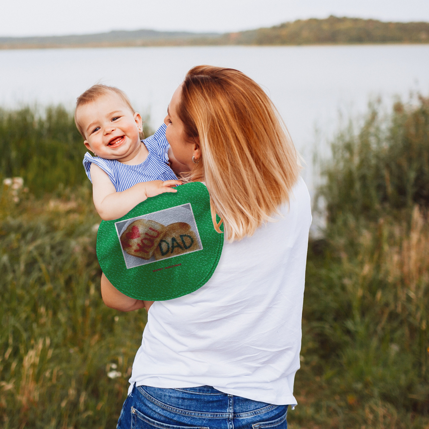 Both our baby bib and burp pad are made up of soft, microfiber velour with a cotton backing. The comfortable and plush material of our bib and burp set is perfect for both baby and parent. We print your design on the microfiber velour face fabric with baby safe ink on your customizable bib and burp cloth to ensure safety for the little one! Our drool bib also comes with a Velcro clasp for safe and easy wear while the burp cloth is a unique peanut shape that perfectly hugs over the shoulder.