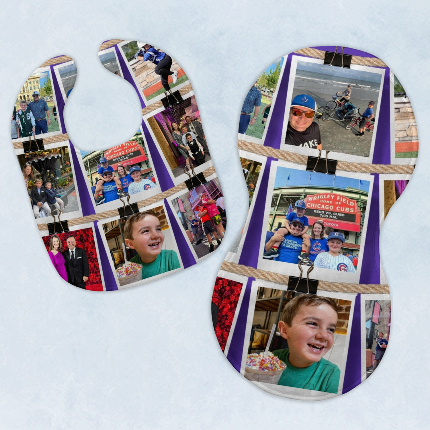 Both our baby bib and burp pad are made up of soft, microfiber velour with a cotton backing. The comfortable and plush material of our bib and burp set is perfect for both baby and parent. We print your design on the microfiber velour face fabric with baby safe ink on your customizable bib and burp cloth to ensure safety for the little one! Our drool bib also comes with a Velcro clasp for safe and easy wear while the burp cloth is a unique peanut shape that perfectly hugs over the shoulder.
