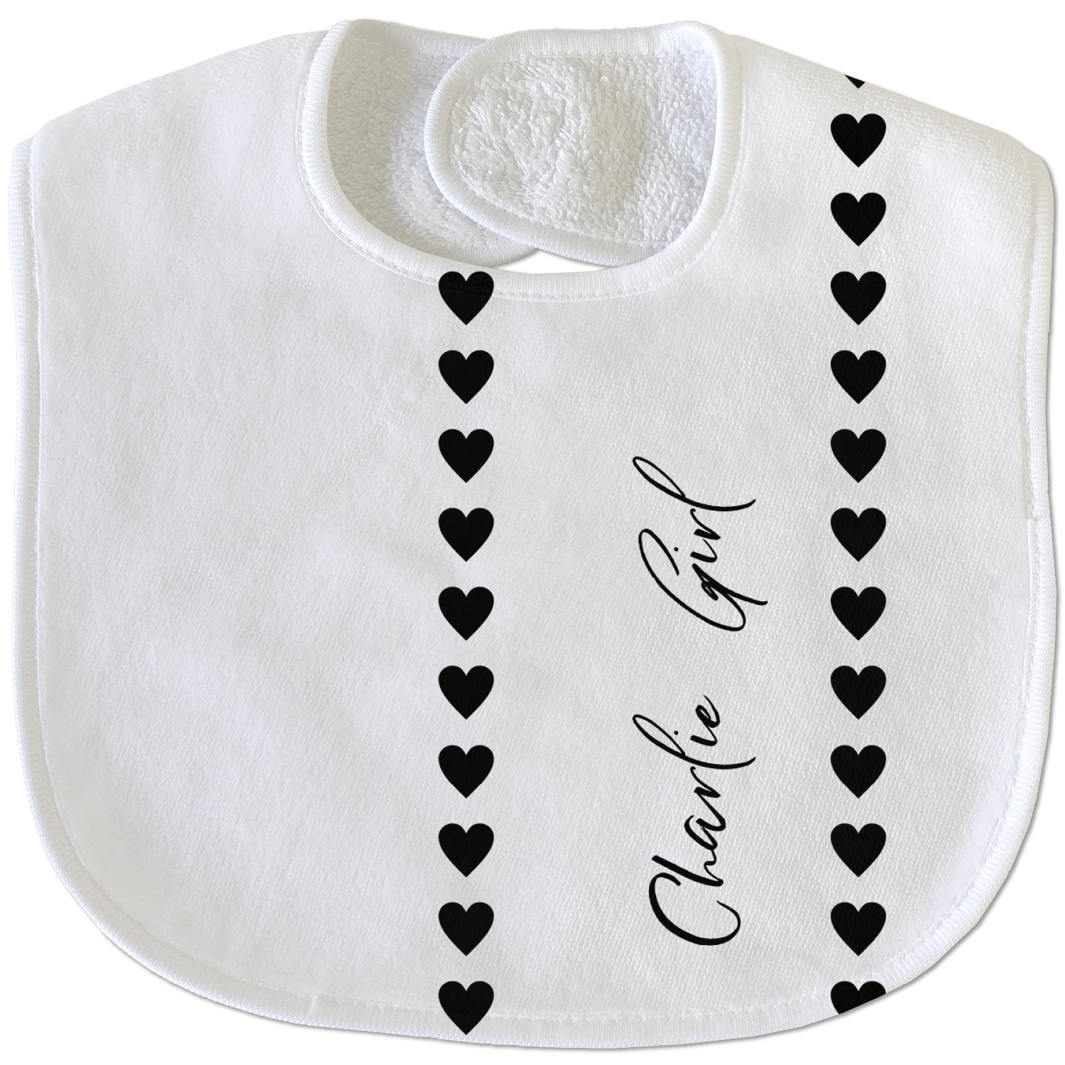 Made of soft polyester, each customizable bib hugs comfortably around the neck to catch every drip and drool. Each bib design is printed with baby-safe ink and finished with a secure stitch pattern and velcro clasp. We carry two customizable bib styles -Microfiber Velour and Jersey Knit.