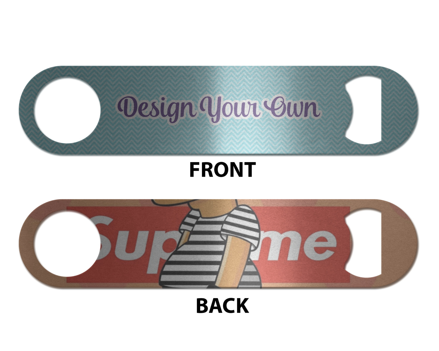 Made from stainless steel, these beer bottle openers are 7 by 1.625 inches, giving you plenty of leverage when trying to open a stubborn bottle. On one end of this personalized bottle opener, you'll find a circular hole for you to hang and display your opener. On the opposite end, you'll find the tool used for opening bottles. This opener in particular has the same structure and style as professional bartender bottle openers. Your customization is sublimated onto both the back and front, and both sides can be customized individually. Choose from one of our two base colors - white or silver.