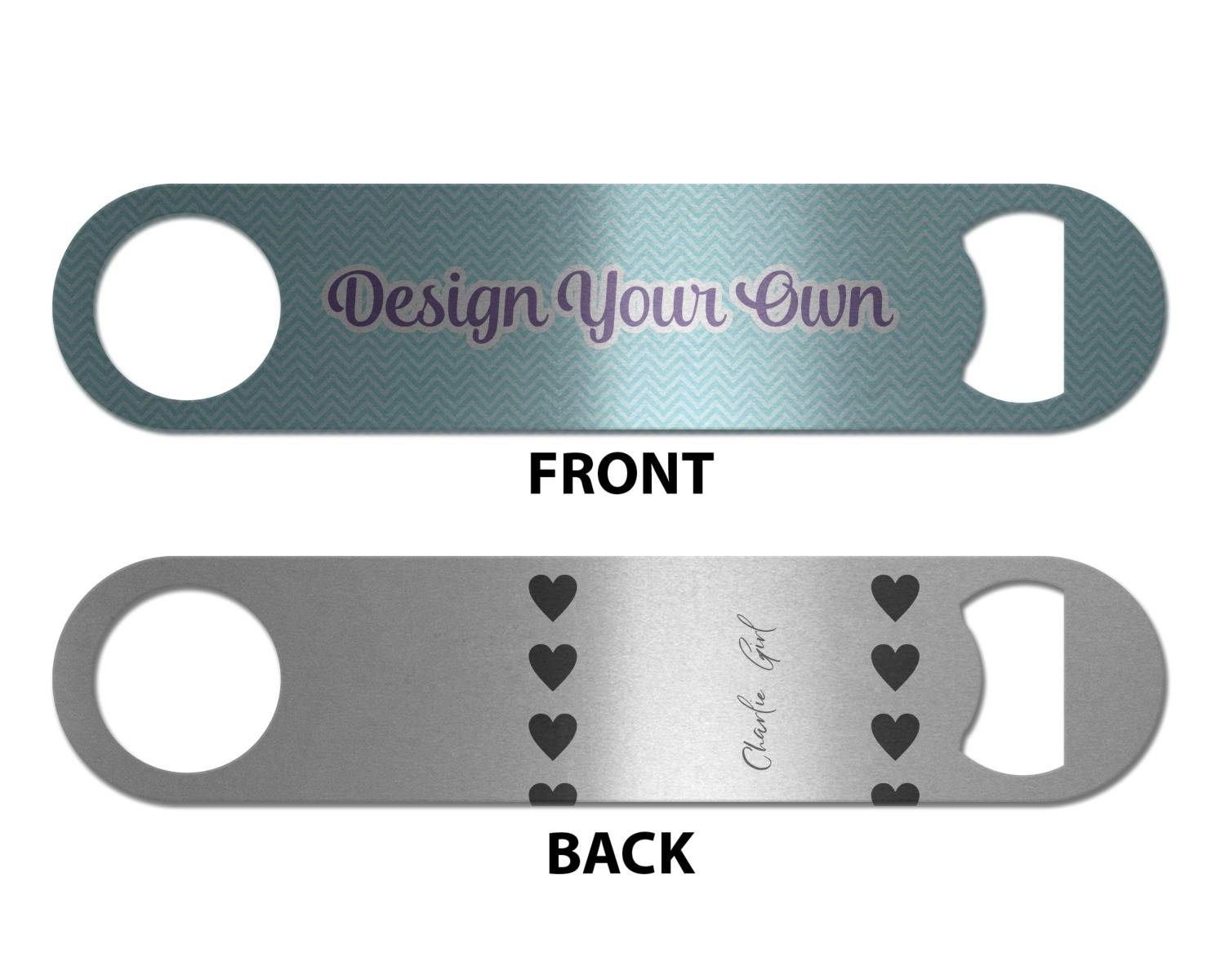 Made from stainless steel, these beer bottle openers are 7 by 1.625 inches, giving you plenty of leverage when trying to open a stubborn bottle. On one end of this personalized bottle opener, you'll find a circular hole for you to hang and display your opener. On the opposite end, you'll find the tool used for opening bottles. This opener in particular has the same structure and style as professional bartender bottle openers. Your customization is sublimated onto both the back and front, and both sides can be customized individually. Choose from one of our two base colors - white or silver.