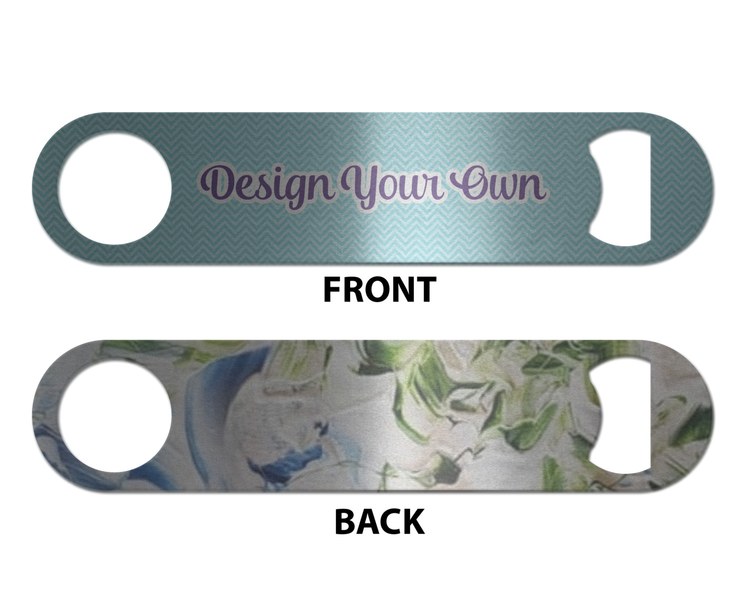 Made from stainless steel, these beer bottle openers are 7 by 1.625 inches, giving you plenty of leverage when trying to open a stubborn bottle. On one end of this personalized bottle opener, you'll find a circular hole for you to hang and display your opener. On the opposite end, you'll find the tool used for opening bottles. This opener in particular has the same structure and style as professional bartender bottle openers. Your customization is sublimated onto both the back and front, and both sides can be customized individually. Choose from one of our two base colors - white or silver.