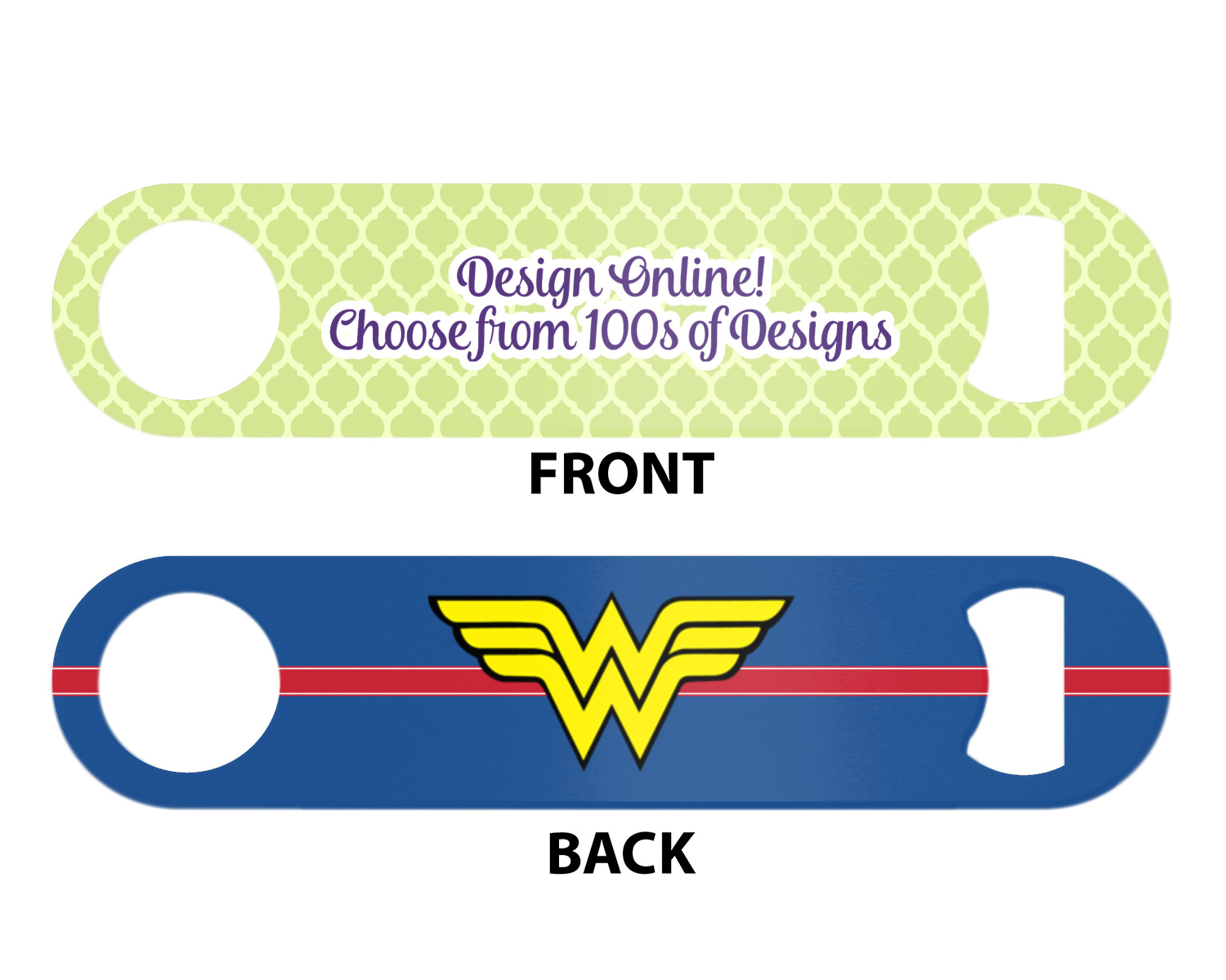 Made from stainless steel, these beer bottle openers are 7 by 1.625 inches, giving you plenty of leverage when trying to open a stubborn bottle. On one end of this personalized bottle opener, you'll find a circular hole for you to hang and display your opener. On the opposite end, you'll find the tool used for opening bottles. This opener in particular has the same structure and style as professional bartender bottle openers. Your customization is sublimated onto both the back and front, and both sides can be customized individually. Choose from one of our two base colors - white or silver.