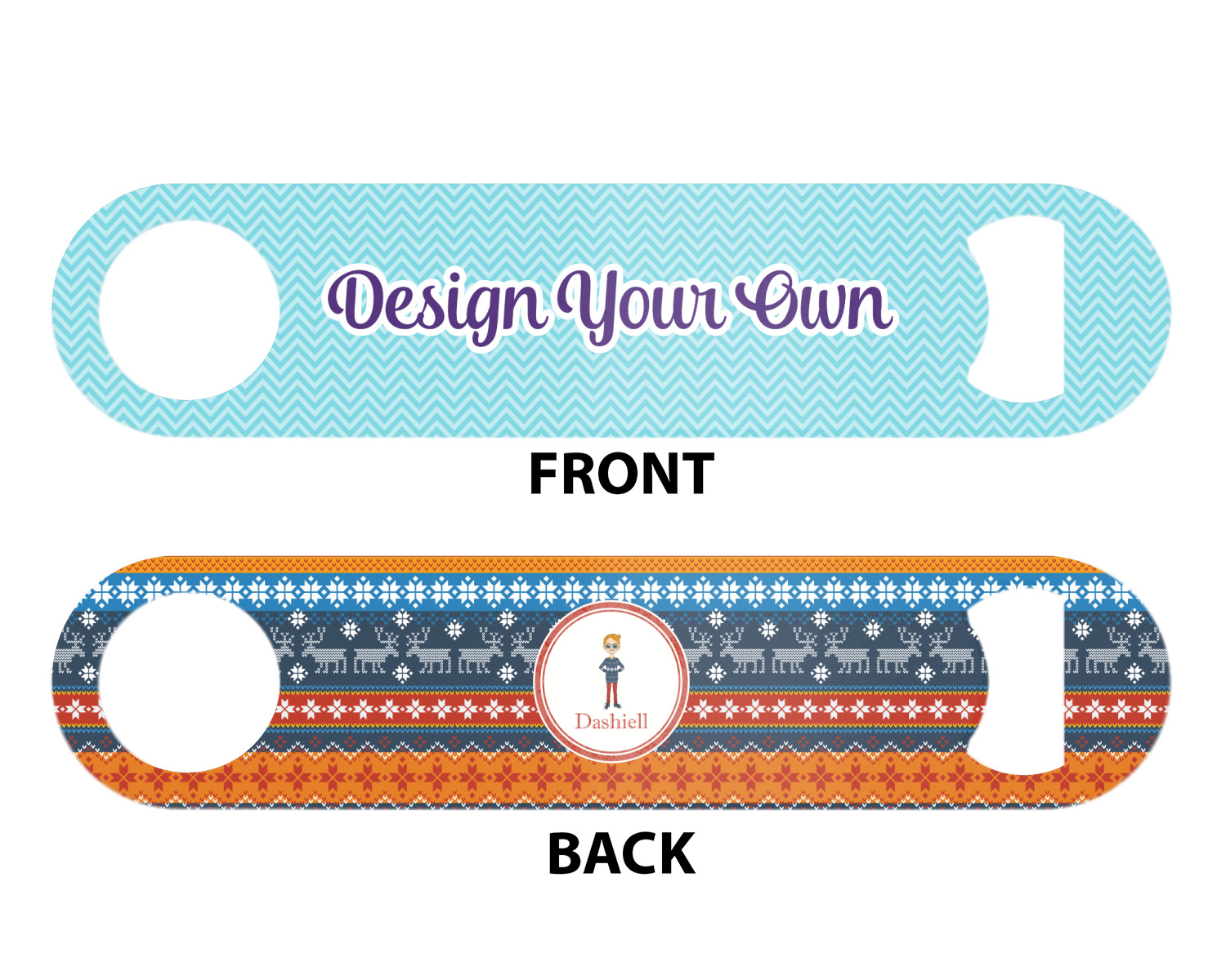 Made from stainless steel, these beer bottle openers are 7 by 1.625 inches, giving you plenty of leverage when trying to open a stubborn bottle. On one end of this personalized bottle opener, you'll find a circular hole for you to hang and display your opener. On the opposite end, you'll find the tool used for opening bottles. This opener in particular has the same structure and style as professional bartender bottle openers. Your customization is sublimated onto both the back and front, and both sides can be customized individually. Choose from one of our two base colors - white or silver.