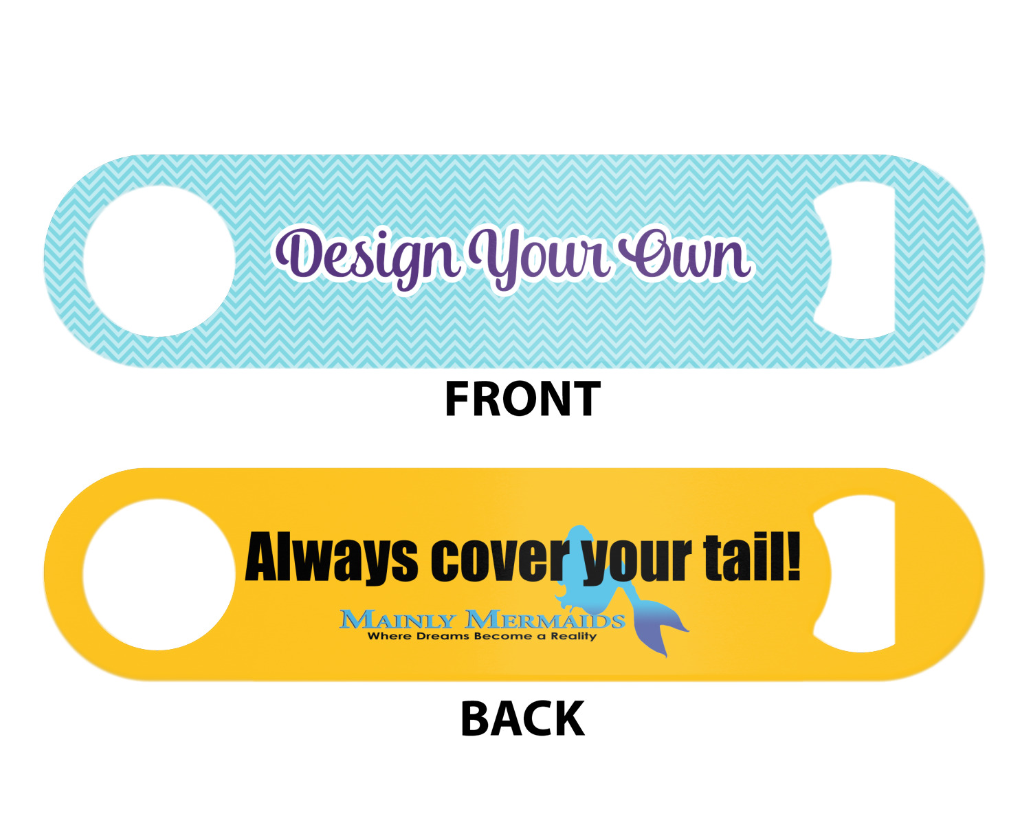 Made from stainless steel, these beer bottle openers are 7 by 1.625 inches, giving you plenty of leverage when trying to open a stubborn bottle. On one end of this personalized bottle opener, you'll find a circular hole for you to hang and display your opener. On the opposite end, you'll find the tool used for opening bottles. This opener in particular has the same structure and style as professional bartender bottle openers. Your customization is sublimated onto both the back and front, and both sides can be customized individually. Choose from one of our two base colors - white or silver.