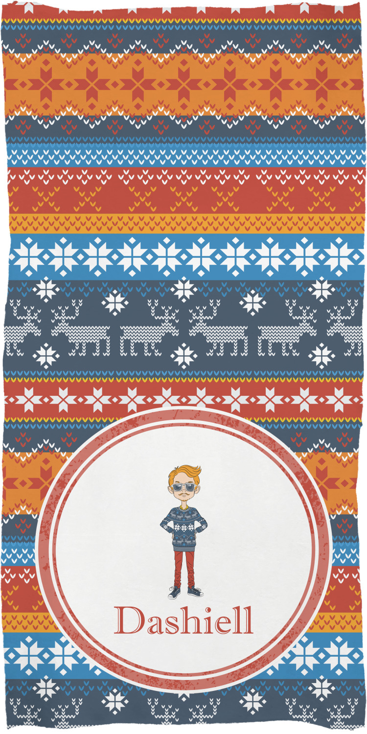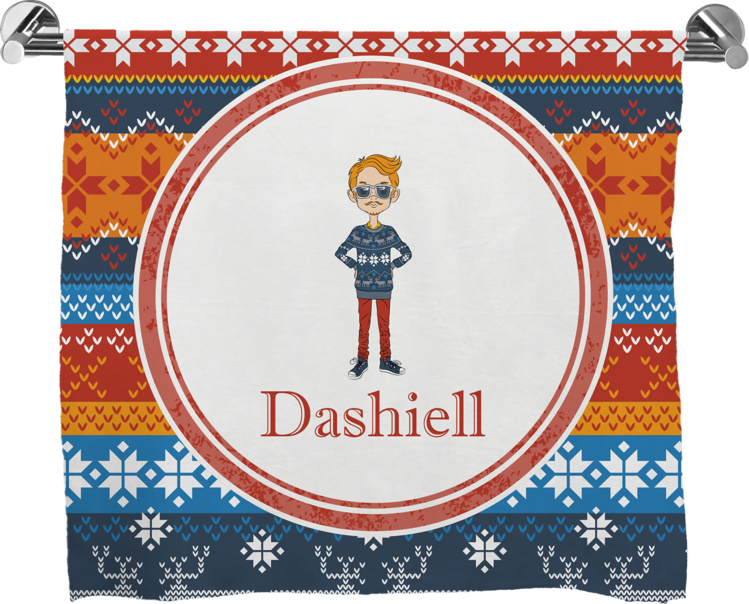 These customized bath towels are slightly larger than your standard towel and are the ideal size for wrapping around your body. They measure approximately 60" x 30". Your customization is displayed across the entire front face of the towel, while the back is white.