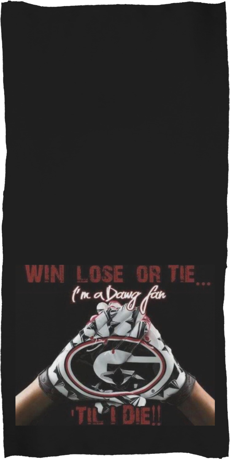 These customized bath towels are slightly larger than your standard towel and are the ideal size for wrapping around your body. They measure approximately 60" x 30". Your customization is displayed across the entire front face of the towel, while the back is white.