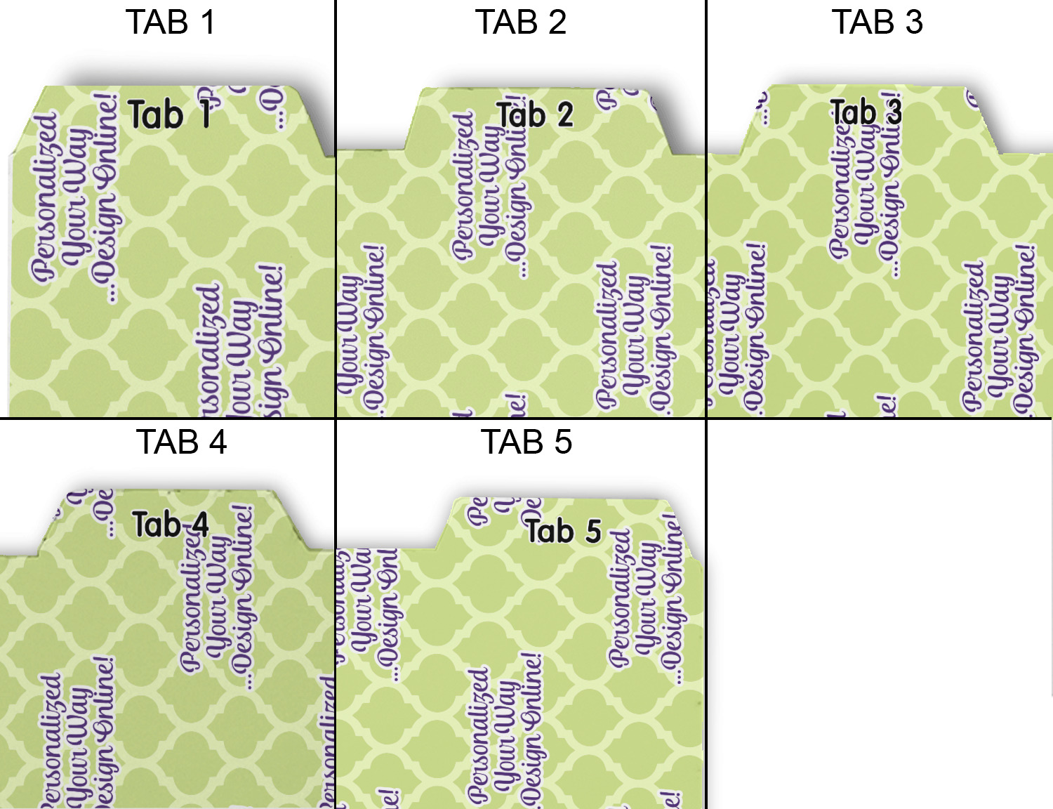 Whether you use binders at school or at work, we have designs to suit all of them. Available in 5 or 6 tab sets, you are sure to find a set to suit your needs. The back of each one is white and can be used to take notes, write vital information on, etc.