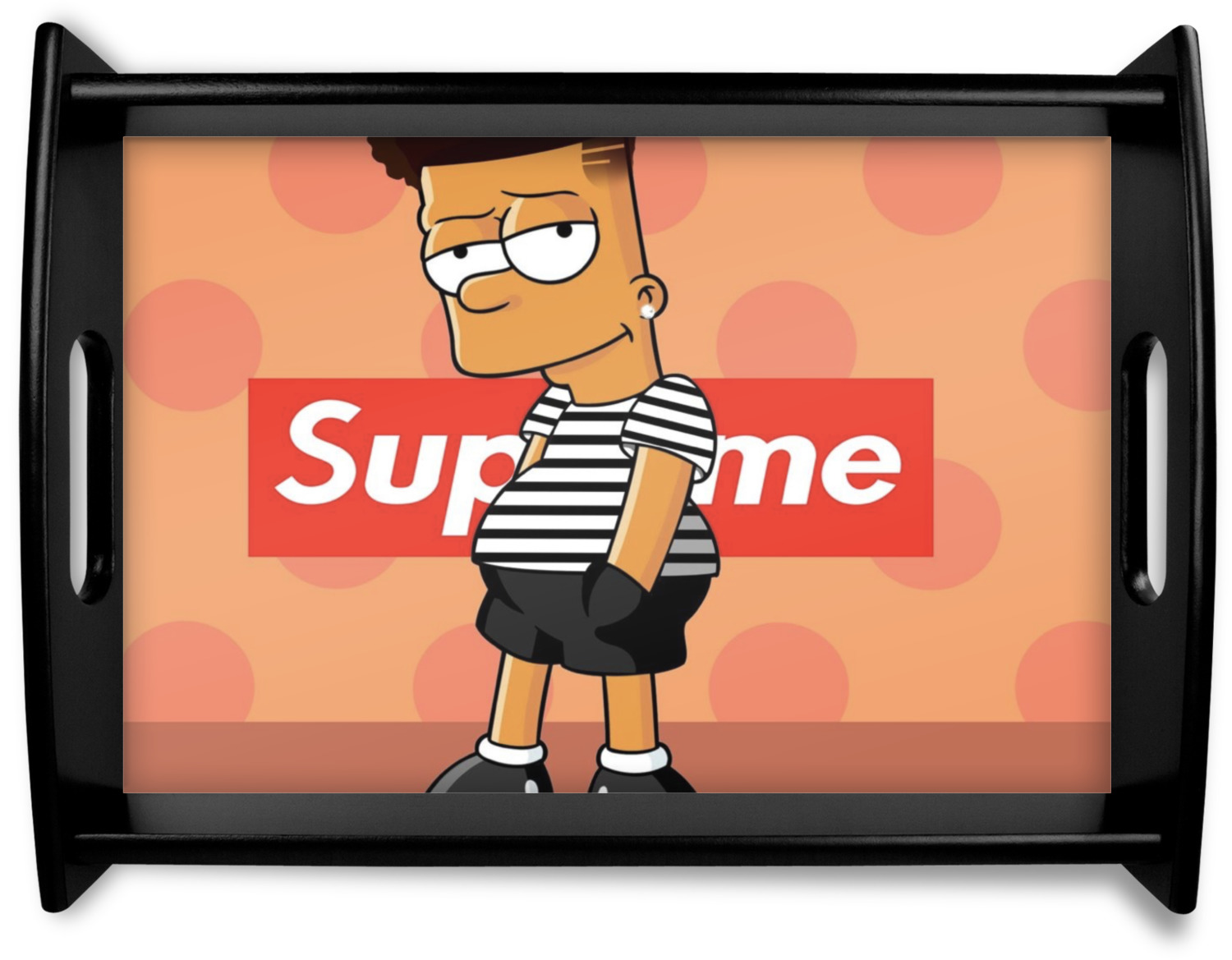 This serving tray with handles features square edges and two rounded sides, creating a very modern look. Each side is fabricated from a beautifully cut, natural wood. The bottom of the interior of the tray displays your customized design in bright, vibrant color. The tray is sold in both a black color and a natural wood look. Each variation of the wood serving tray has two sizes: Small, which is 14" x 10" x 2.25", and Large, which is 19.5" x 13.5" x 2.75".
