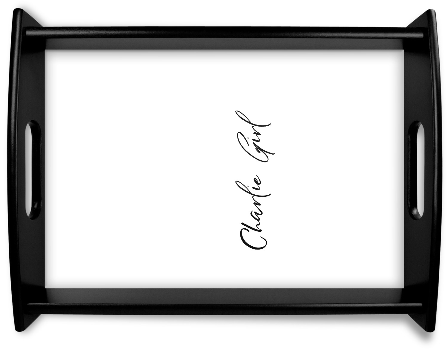 This serving tray with handles features square edges and two rounded sides, creating a very modern look. Each side is fabricated from a beautifully cut, natural wood. The bottom of the interior of the tray displays your customized design in bright, vibrant color. The tray is sold in both a black color and a natural wood look. Each variation of the wood serving tray has two sizes: Small, which is 14" x 10" x 2.25", and Large, which is 19.5" x 13.5" x 2.75".