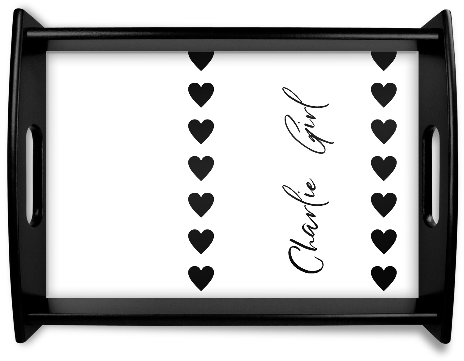 This serving tray with handles features square edges and two rounded sides, creating a very modern look. Each side is fabricated from a beautifully cut, natural wood. The bottom of the interior of the tray displays your customized design in bright, vibrant color. The tray is sold in both a black color and a natural wood look. Each variation of the wood serving tray has two sizes: Small, which is 14" x 10" x 2.25", and Large, which is 19.5" x 13.5" x 2.75".