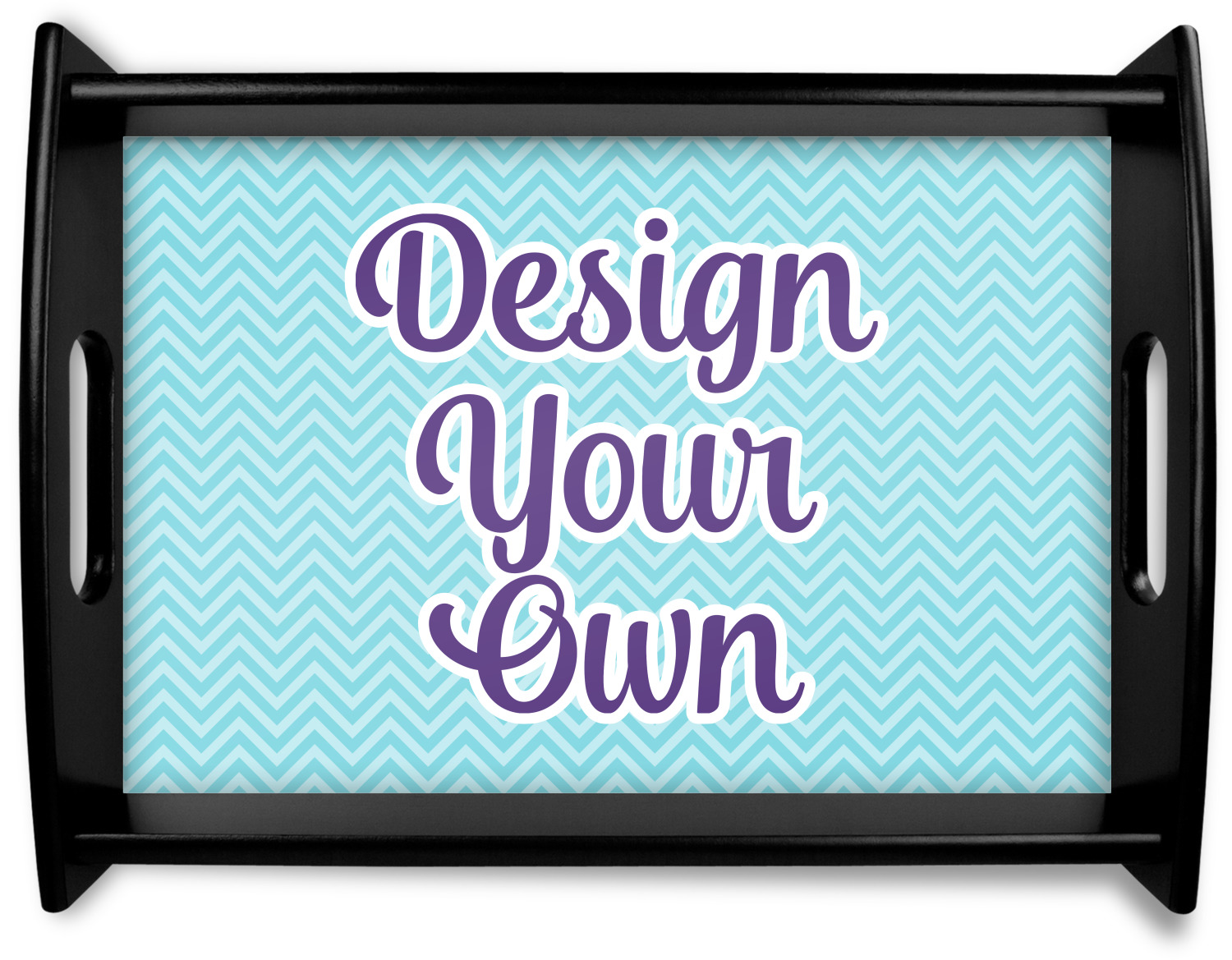 This serving tray with handles features square edges and two rounded sides, creating a very modern look. Each side is fabricated from a beautifully cut, natural wood. The bottom of the interior of the tray displays your customized design in bright, vibrant color. The tray is sold in both a black color and a natural wood look. Each variation of the wood serving tray has two sizes: Small, which is 14" x 10" x 2.25", and Large, which is 19.5" x 13.5" x 2.75".