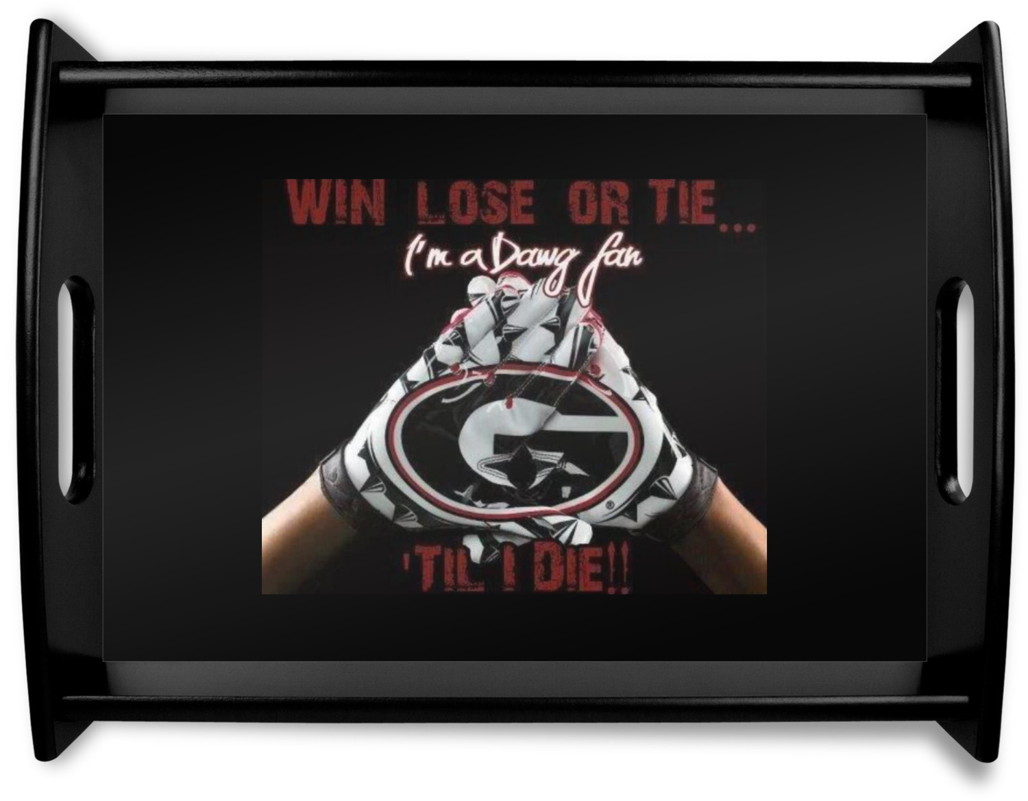 This serving tray with handles features square edges and two rounded sides, creating a very modern look. Each side is fabricated from a beautifully cut, natural wood. The bottom of the interior of the tray displays your customized design in bright, vibrant color. The tray is sold in both a black color and a natural wood look. Each variation of the wood serving tray has two sizes: Small, which is 14" x 10" x 2.25", and Large, which is 19.5" x 13.5" x 2.75".