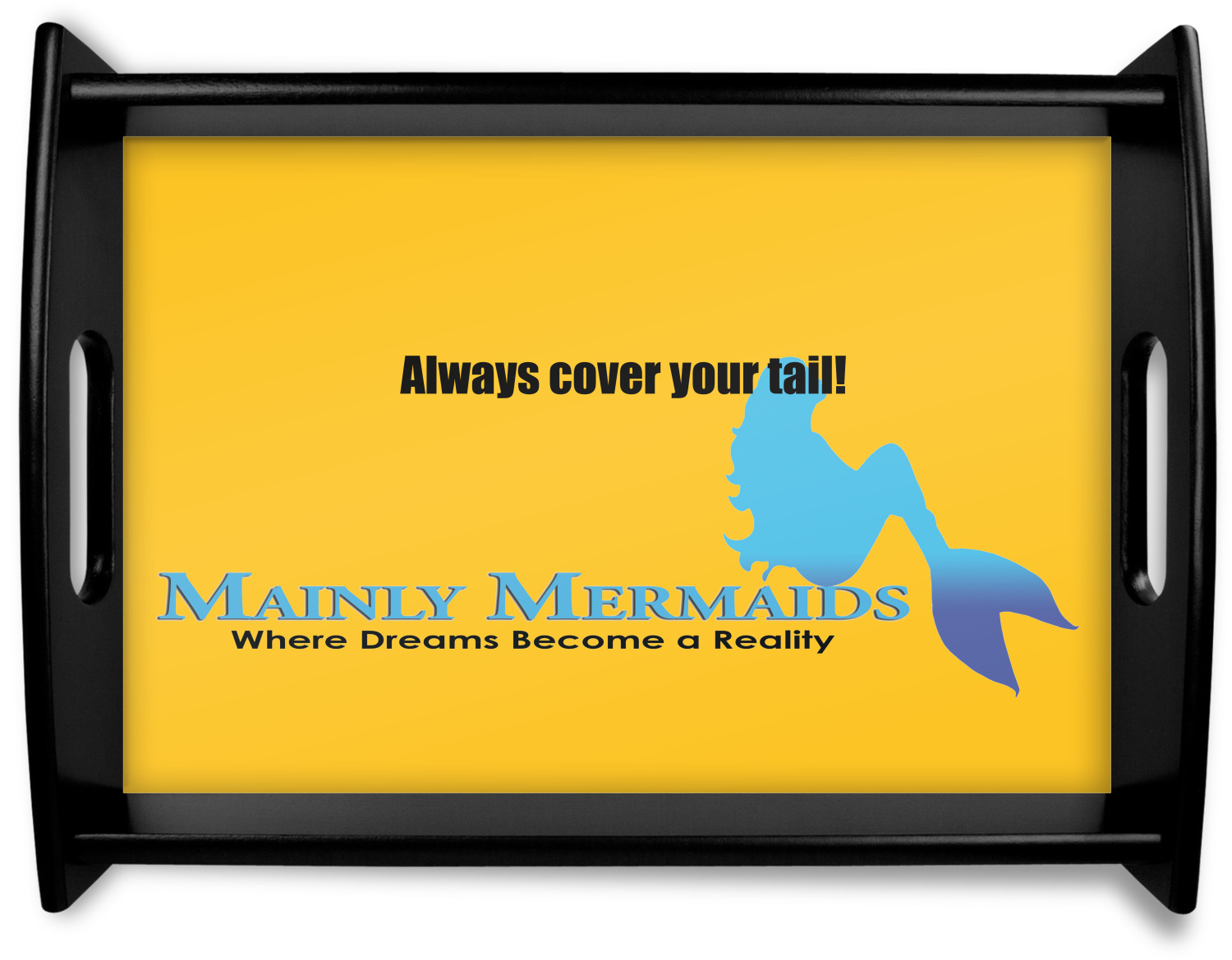 This serving tray with handles features square edges and two rounded sides, creating a very modern look. Each side is fabricated from a beautifully cut, natural wood. The bottom of the interior of the tray displays your customized design in bright, vibrant color. The tray is sold in both a black color and a natural wood look. Each variation of the wood serving tray has two sizes: Small, which is 14" x 10" x 2.25", and Large, which is 19.5" x 13.5" x 2.75".