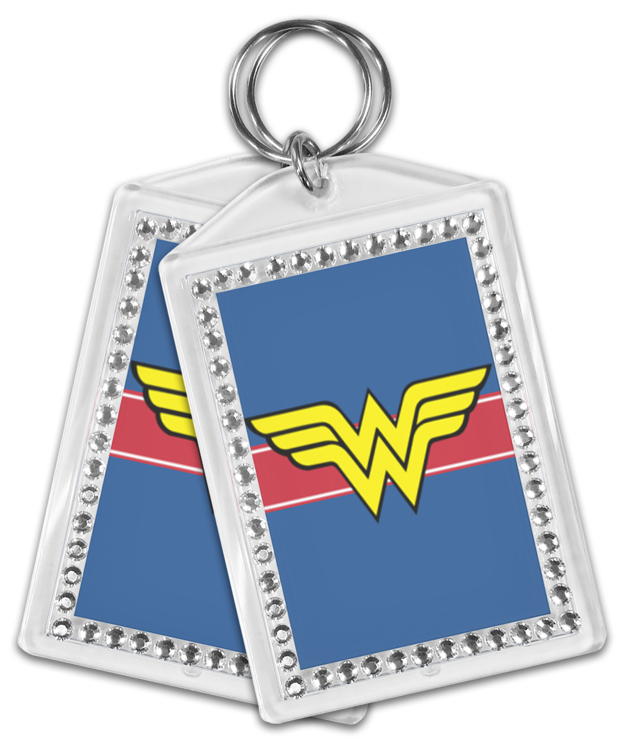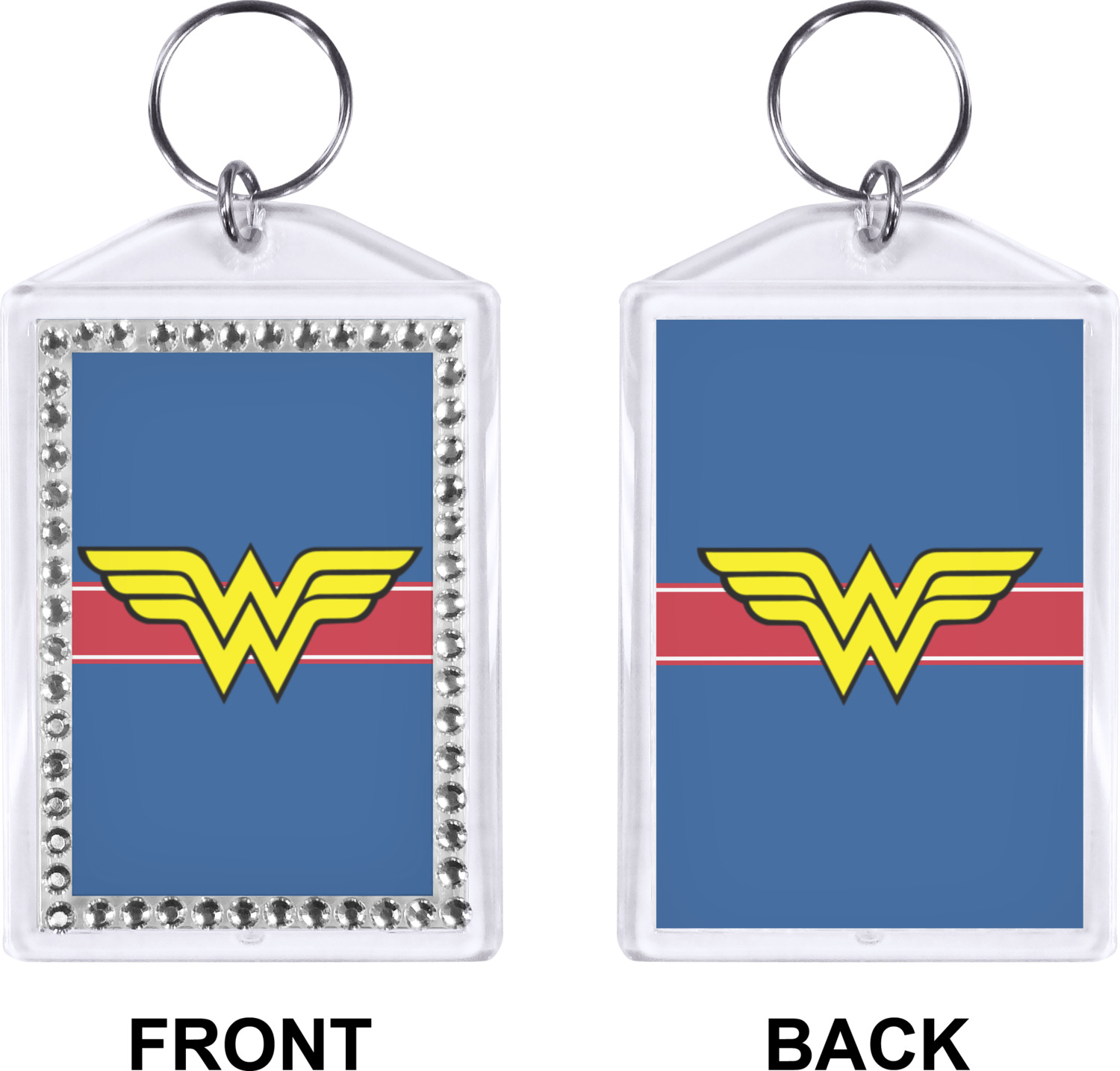 Our personalized keychains have a bold, rectangular shape, outlined by a series of shimmering rhinestones. A metal, split keyring is included with your purchase, and an additional metal hoop allows for attachment of the keychain to the split ring. This unique keychain measures at about 3.75 by 2.5 inches. We print your customized design(s) across both the back and front of this keychain.