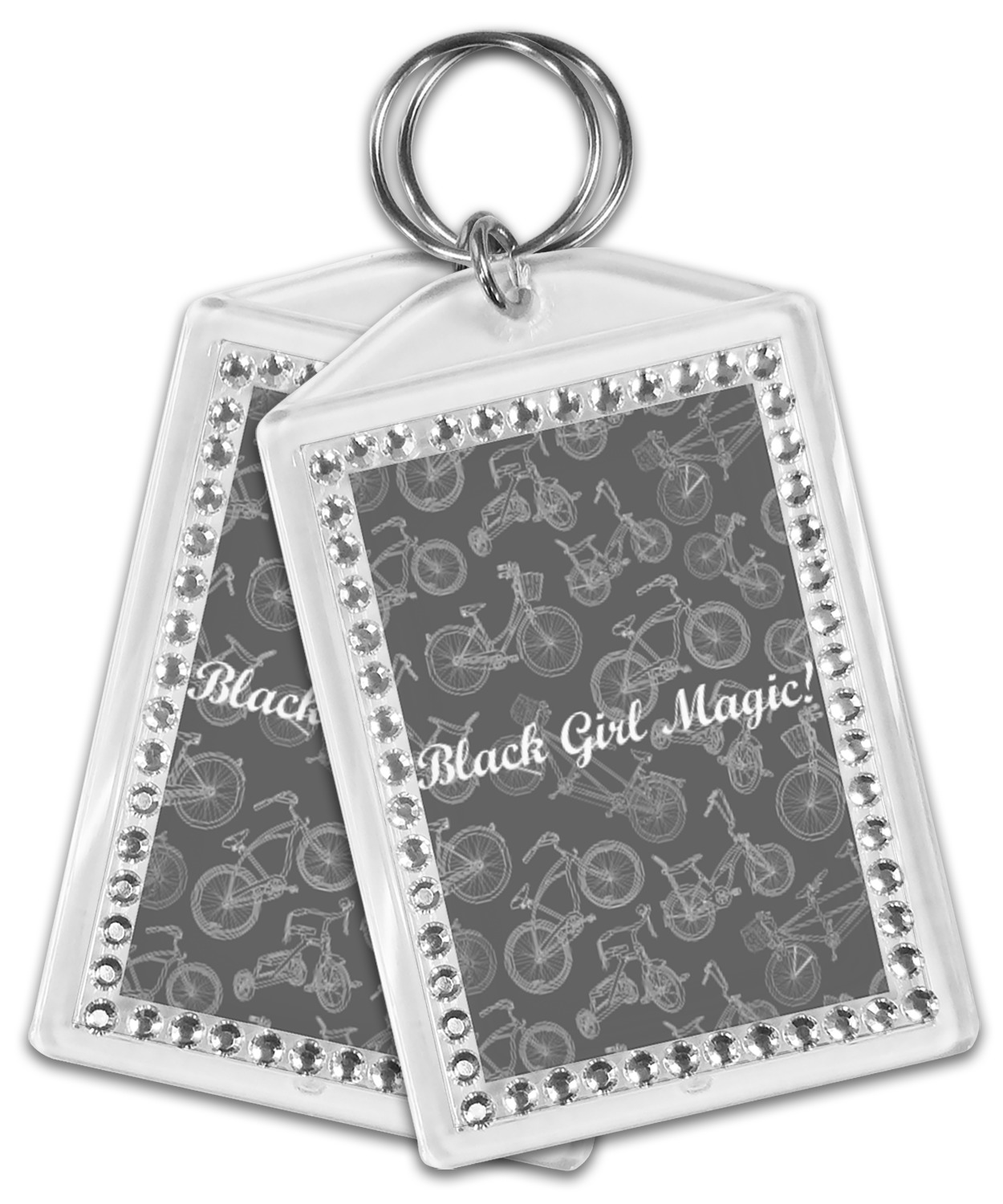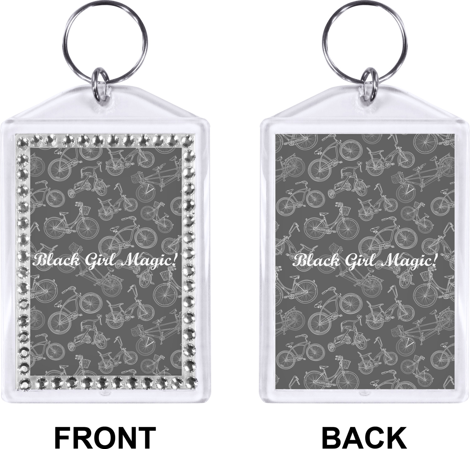 Our personalized keychains have a bold, rectangular shape, outlined by a series of shimmering rhinestones. A metal, split keyring is included with your purchase, and an additional metal hoop allows for attachment of the keychain to the split ring. This unique keychain measures at about 3.75 by 2.5 inches. We print your customized design(s) across both the back and front of this keychain.