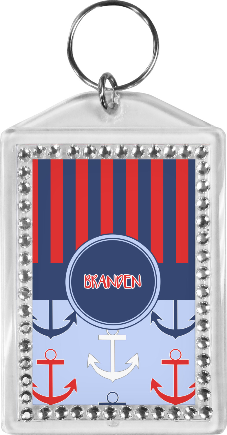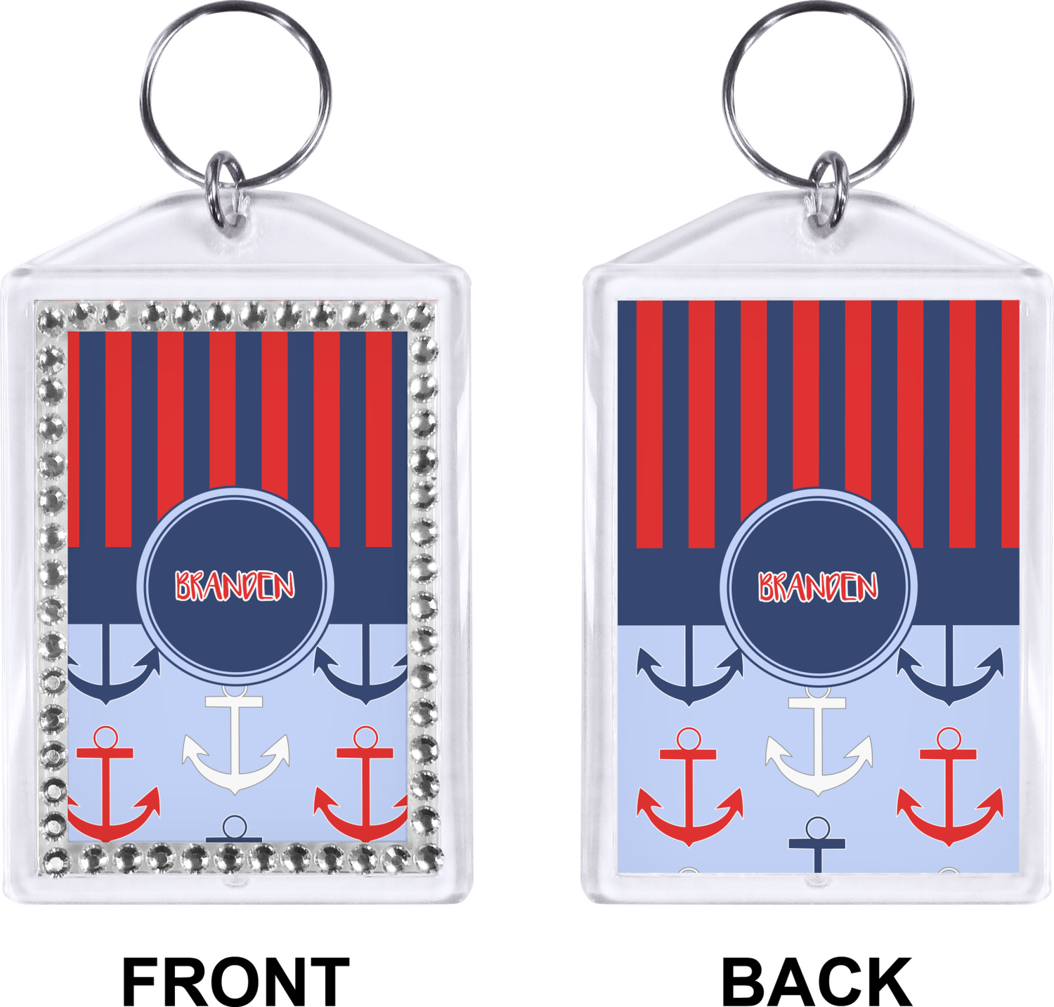 Our personalized keychains have a bold, rectangular shape, outlined by a series of shimmering rhinestones. A metal, split keyring is included with your purchase, and an additional metal hoop allows for attachment of the keychain to the split ring. This unique keychain measures at about 3.75 by 2.5 inches. We print your customized design(s) across both the back and front of this keychain.