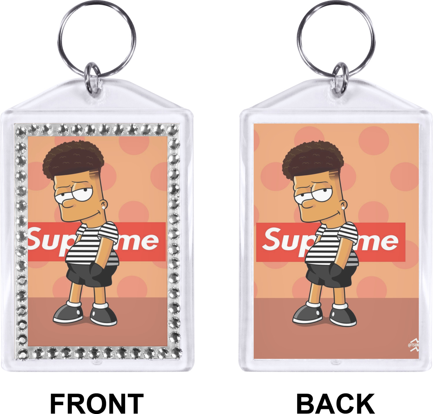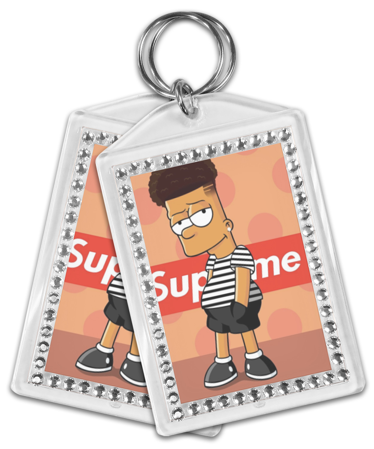 Our personalized keychains have a bold, rectangular shape, outlined by a series of shimmering rhinestones. A metal, split keyring is included with your purchase, and an additional metal hoop allows for attachment of the keychain to the split ring. This unique keychain measures at about 3.75 by 2.5 inches. We print your customized design(s) across both the back and front of this keychain.