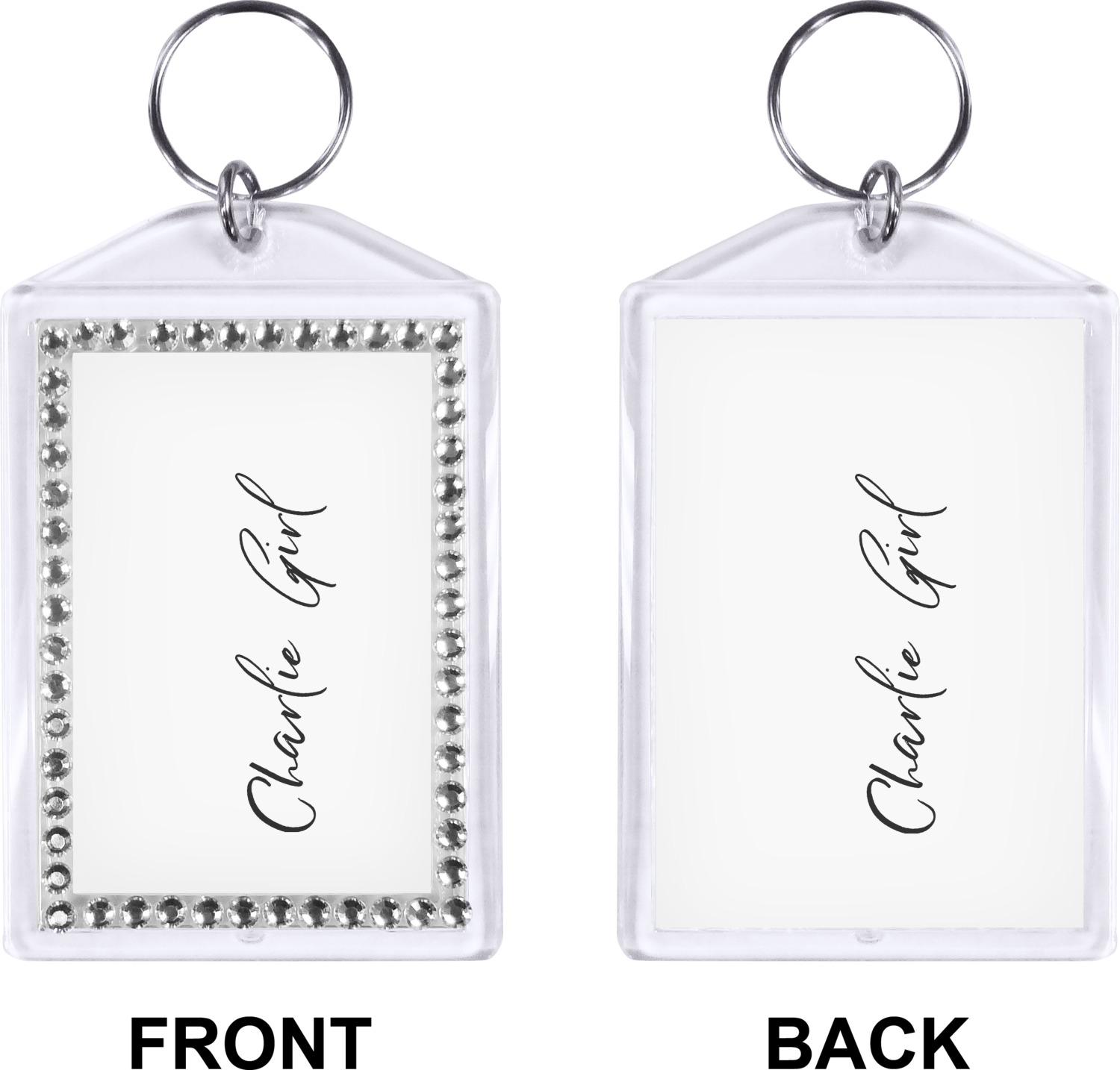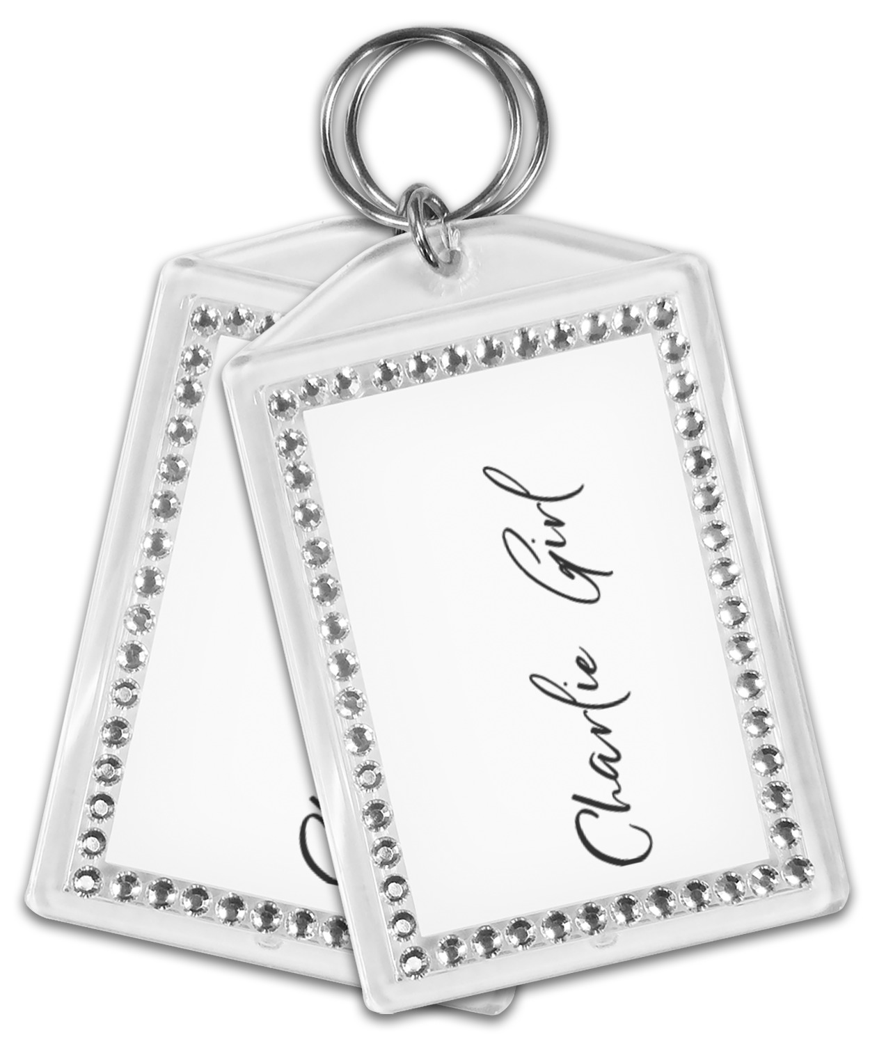 Our personalized keychains have a bold, rectangular shape, outlined by a series of shimmering rhinestones. A metal, split keyring is included with your purchase, and an additional metal hoop allows for attachment of the keychain to the split ring. This unique keychain measures at about 3.75 by 2.5 inches. We print your customized design(s) across both the back and front of this keychain.