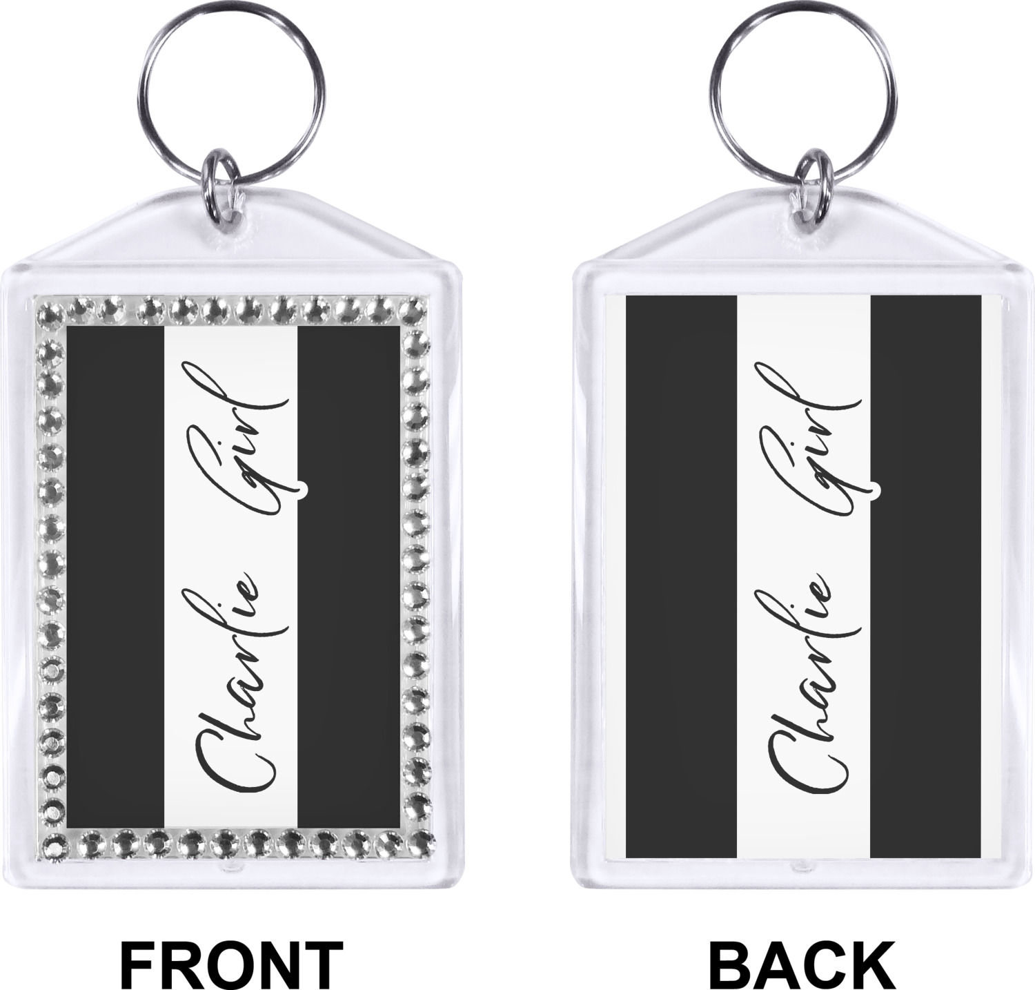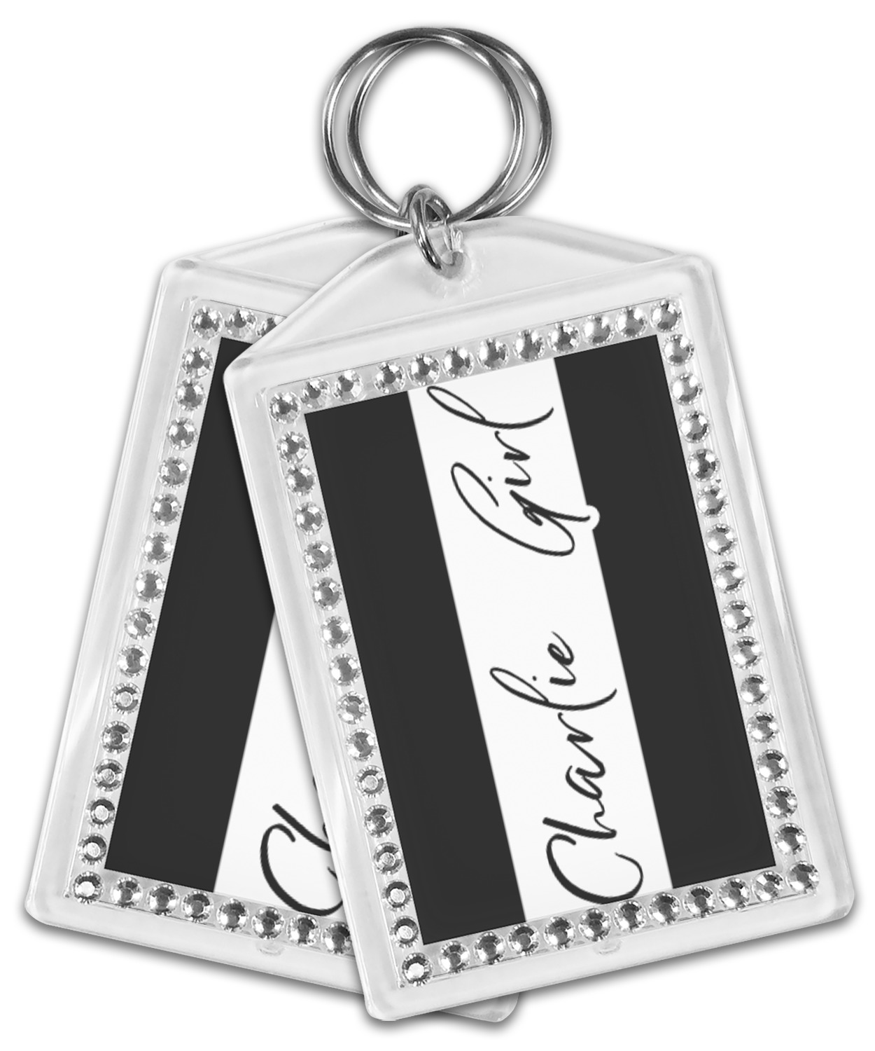Our personalized keychains have a bold, rectangular shape, outlined by a series of shimmering rhinestones. A metal, split keyring is included with your purchase, and an additional metal hoop allows for attachment of the keychain to the split ring. This unique keychain measures at about 3.75 by 2.5 inches. We print your customized design(s) across both the back and front of this keychain.