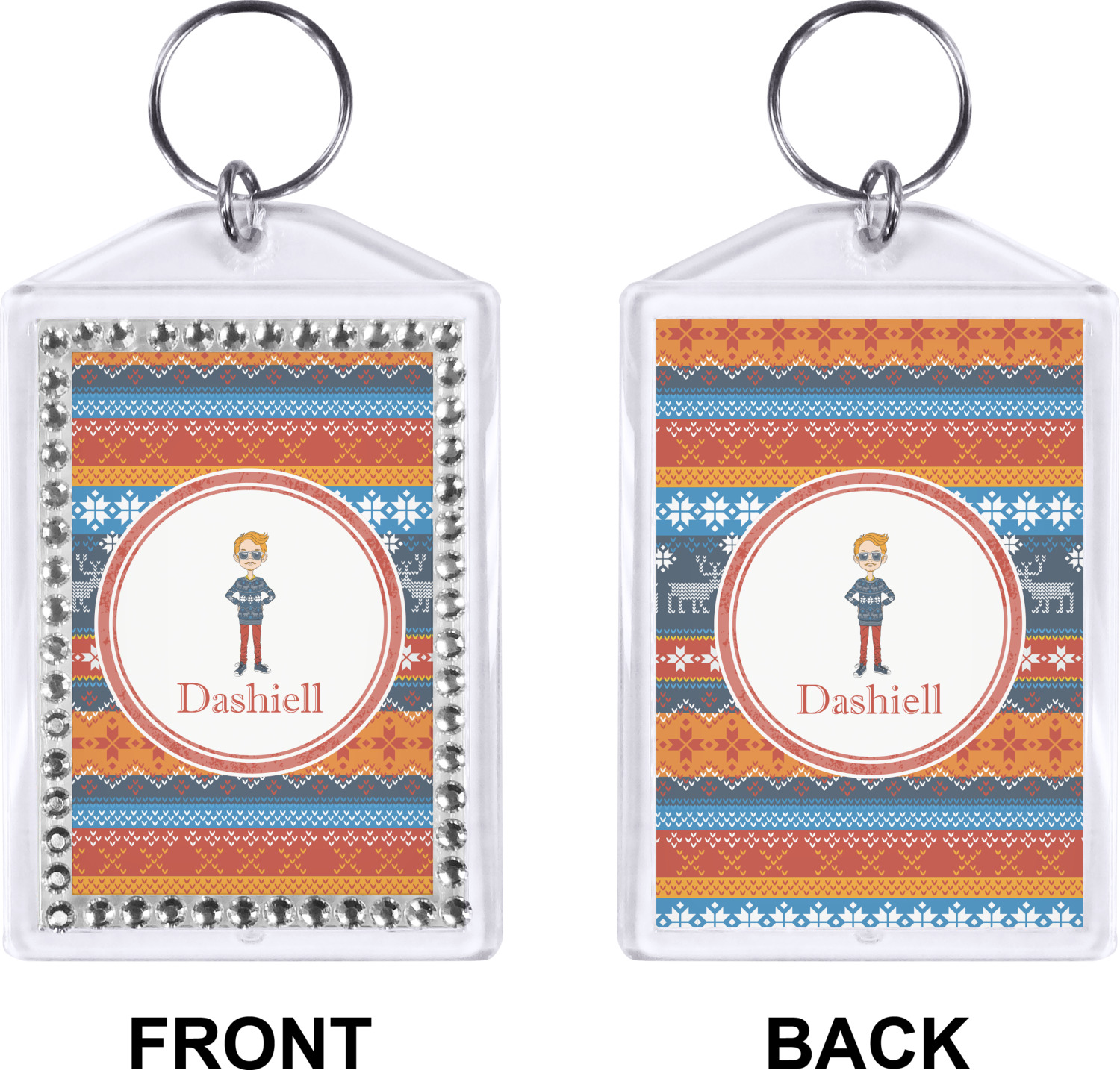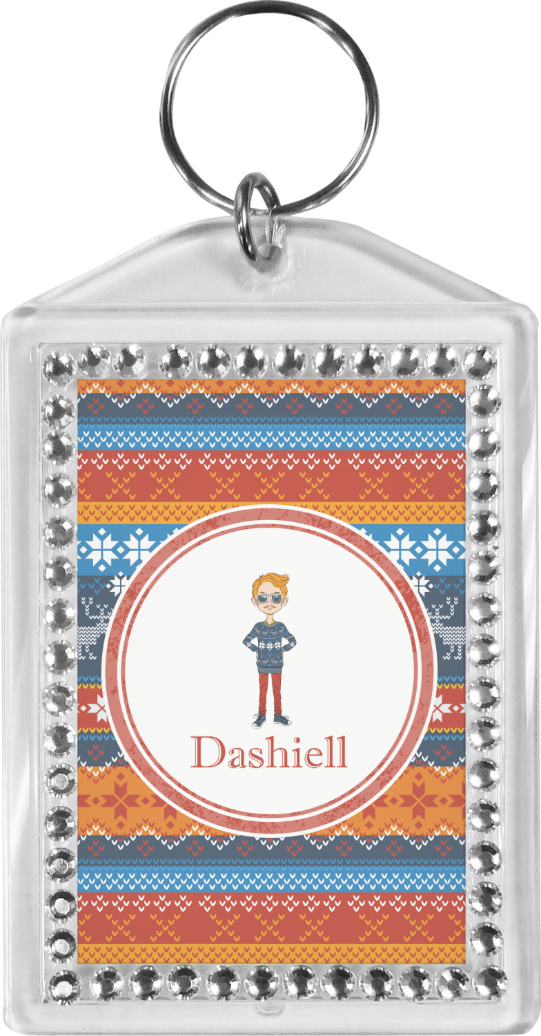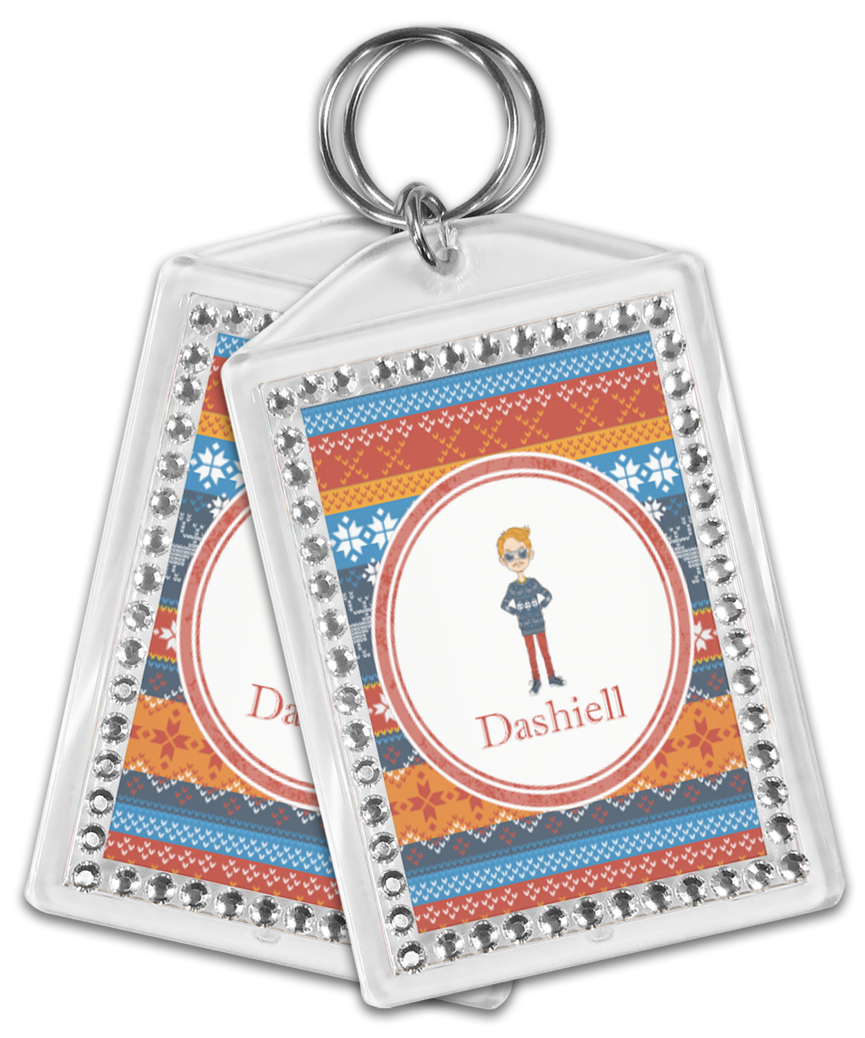 Our personalized keychains have a bold, rectangular shape, outlined by a series of shimmering rhinestones. A metal, split keyring is included with your purchase, and an additional metal hoop allows for attachment of the keychain to the split ring. This unique keychain measures at about 3.75 by 2.5 inches. We print your customized design(s) across both the back and front of this keychain.