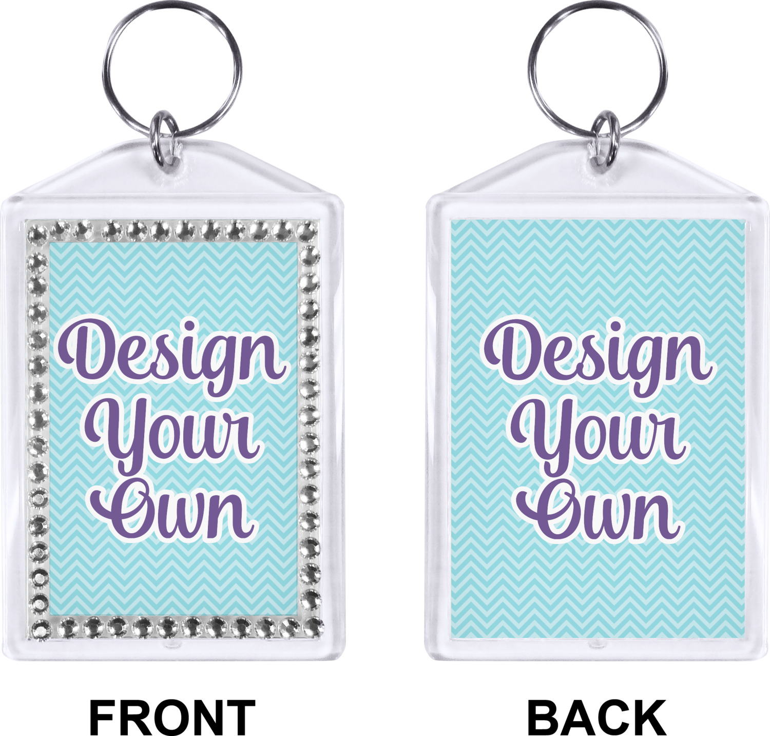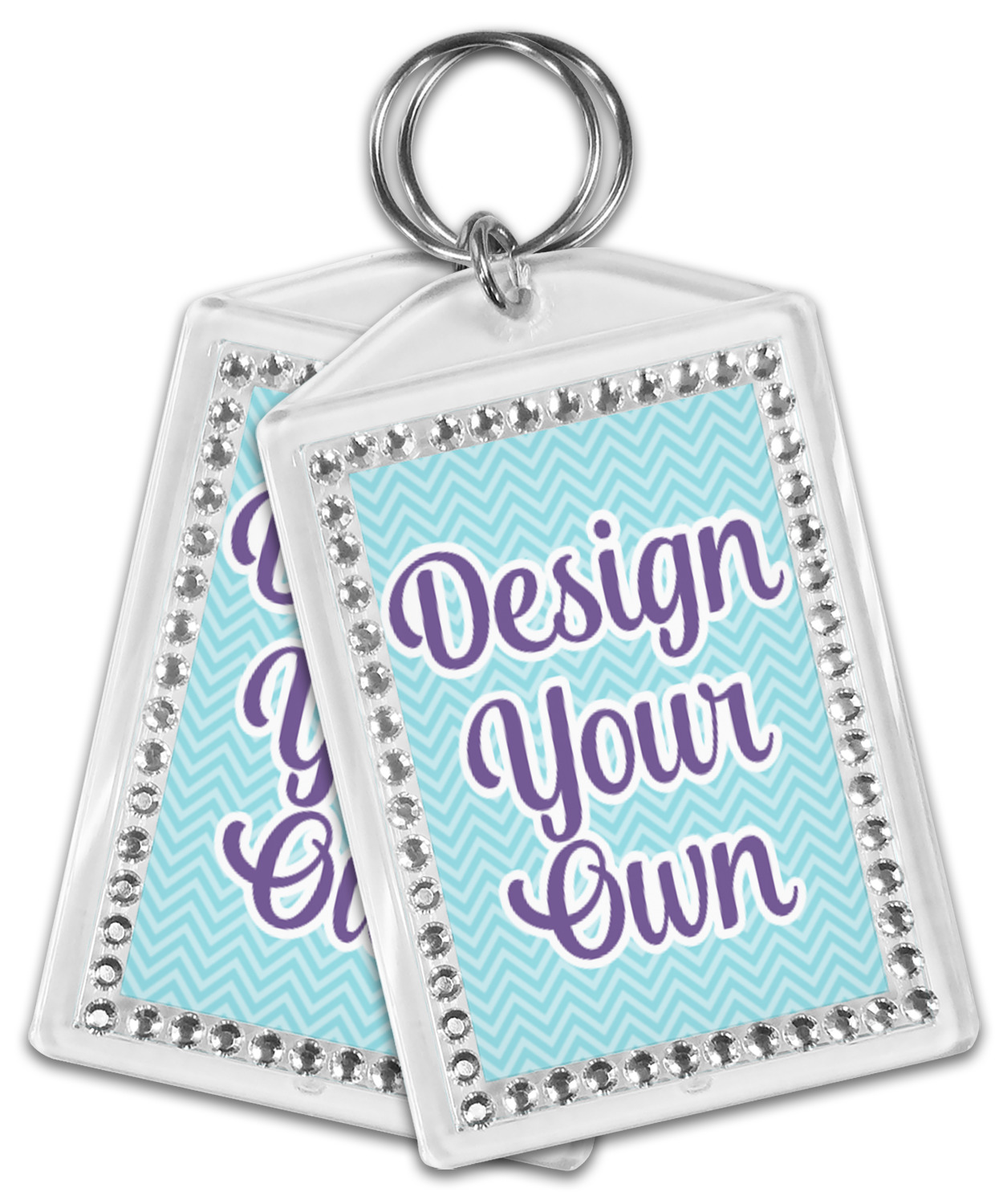 Our personalized keychains have a bold, rectangular shape, outlined by a series of shimmering rhinestones. A metal, split keyring is included with your purchase, and an additional metal hoop allows for attachment of the keychain to the split ring. This unique keychain measures at about 3.75 by 2.5 inches. We print your customized design(s) across both the back and front of this keychain.