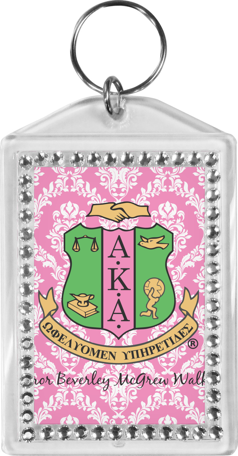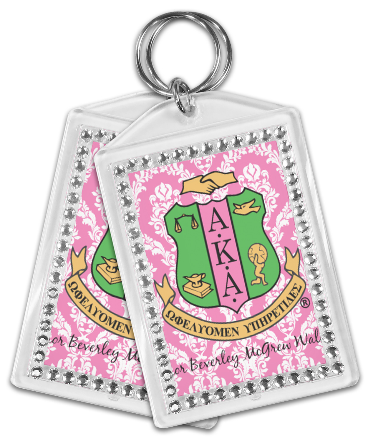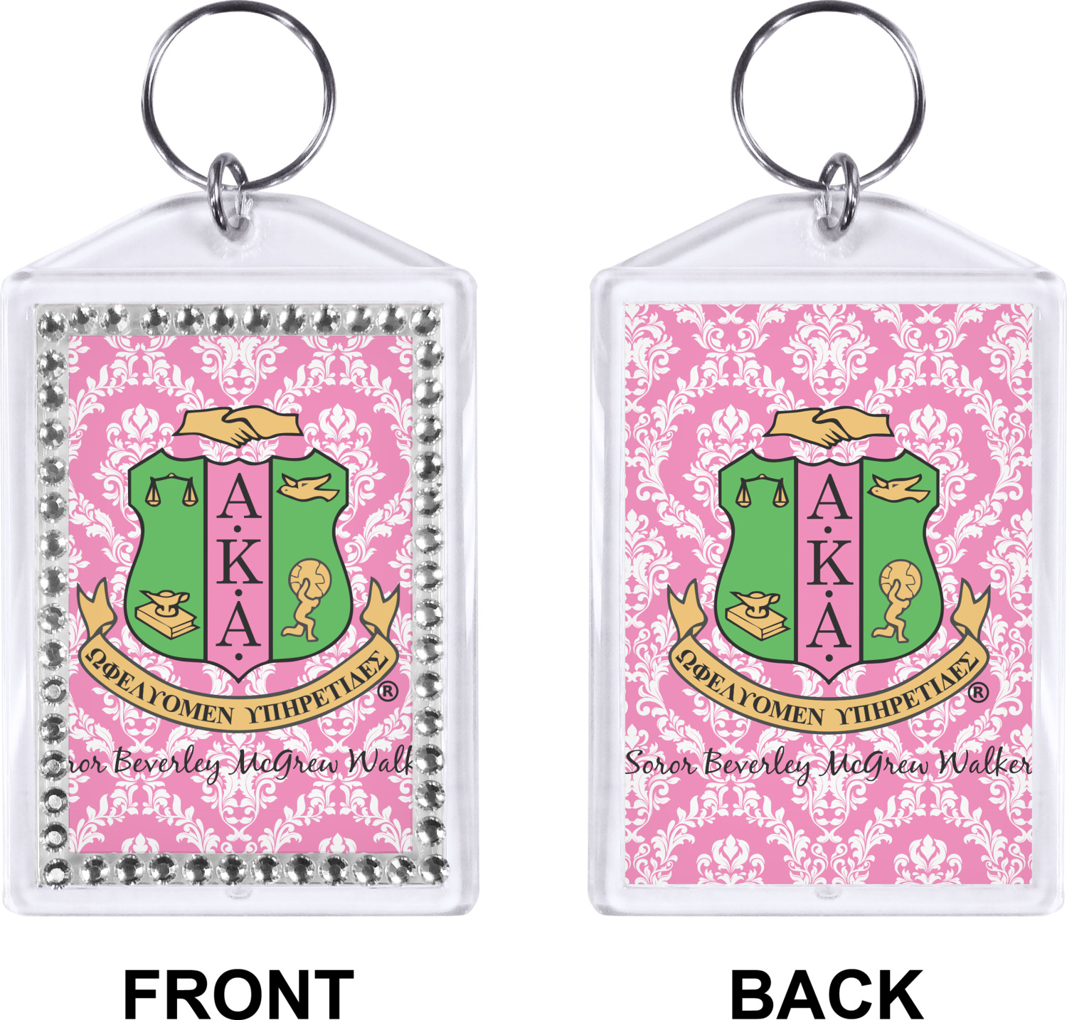 Our personalized keychains have a bold, rectangular shape, outlined by a series of shimmering rhinestones. A metal, split keyring is included with your purchase, and an additional metal hoop allows for attachment of the keychain to the split ring. This unique keychain measures at about 3.75 by 2.5 inches. We print your customized design(s) across both the back and front of this keychain.