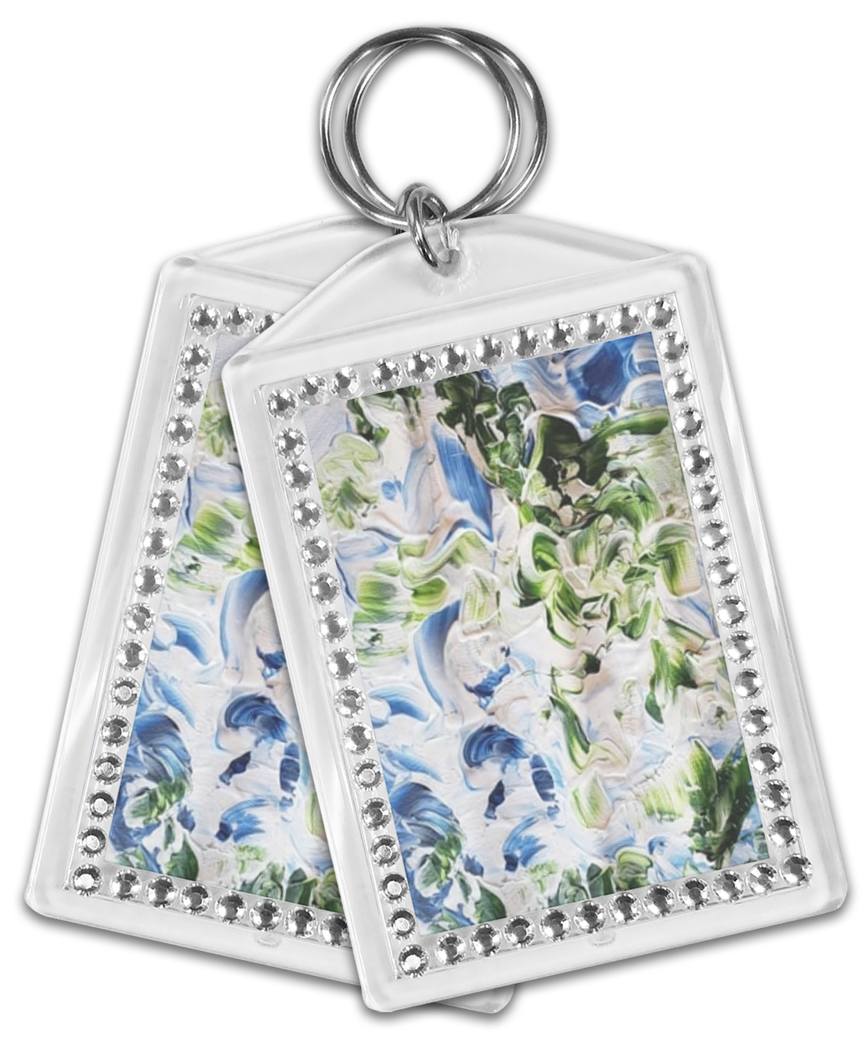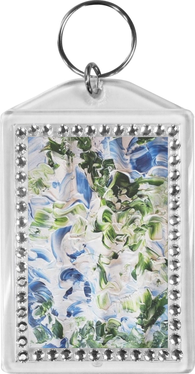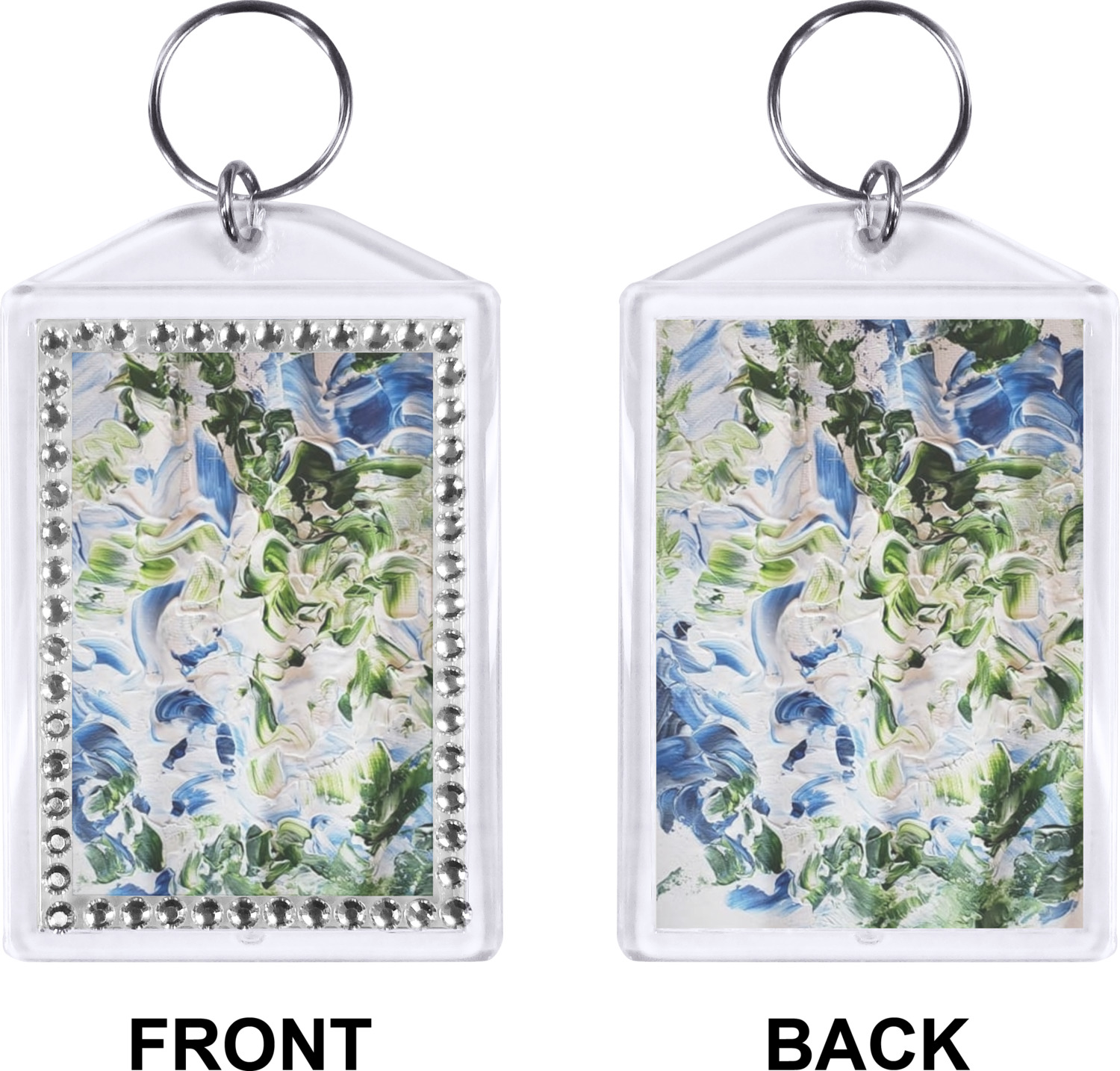 Our personalized keychains have a bold, rectangular shape, outlined by a series of shimmering rhinestones. A metal, split keyring is included with your purchase, and an additional metal hoop allows for attachment of the keychain to the split ring. This unique keychain measures at about 3.75 by 2.5 inches. We print your customized design(s) across both the back and front of this keychain.