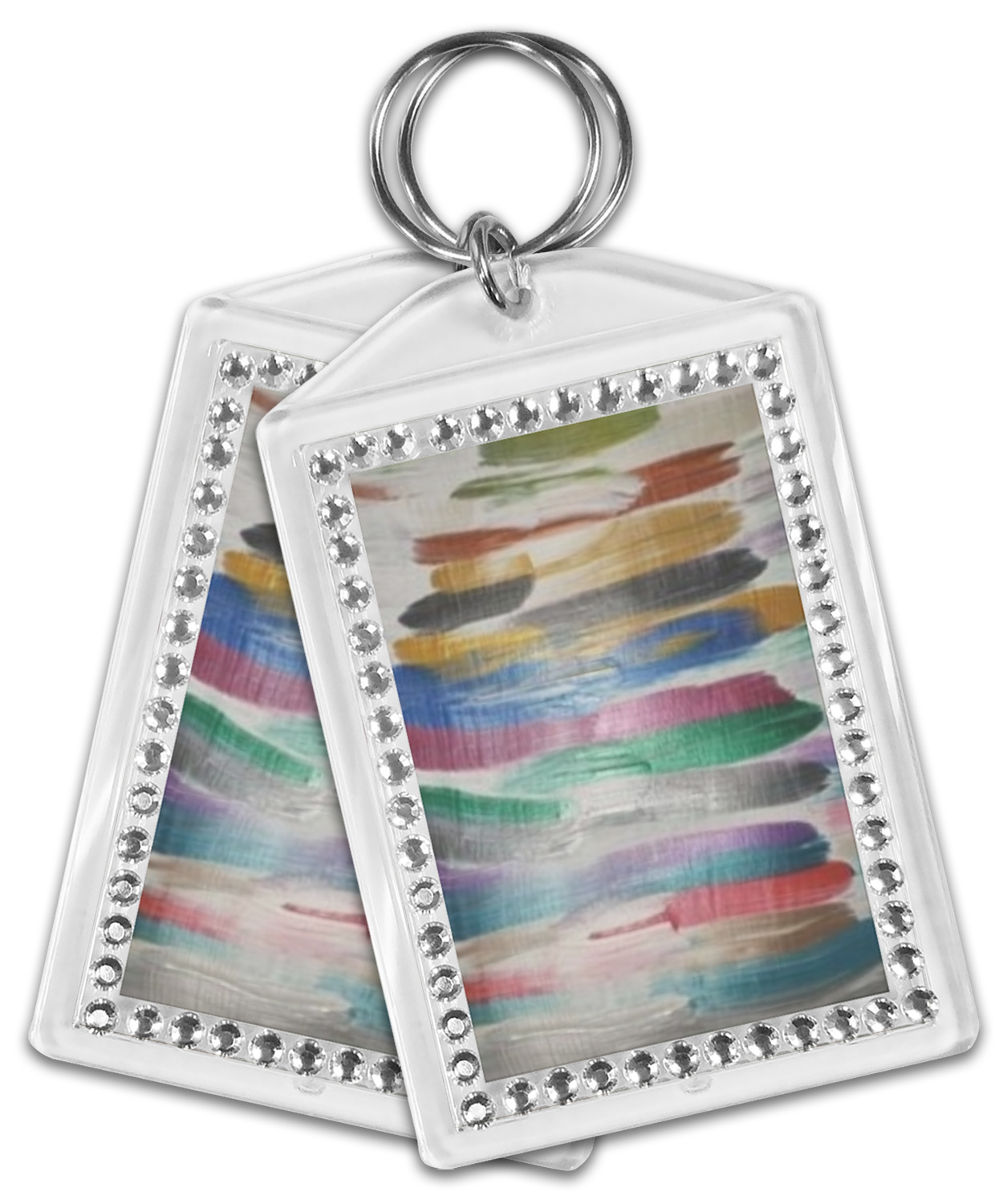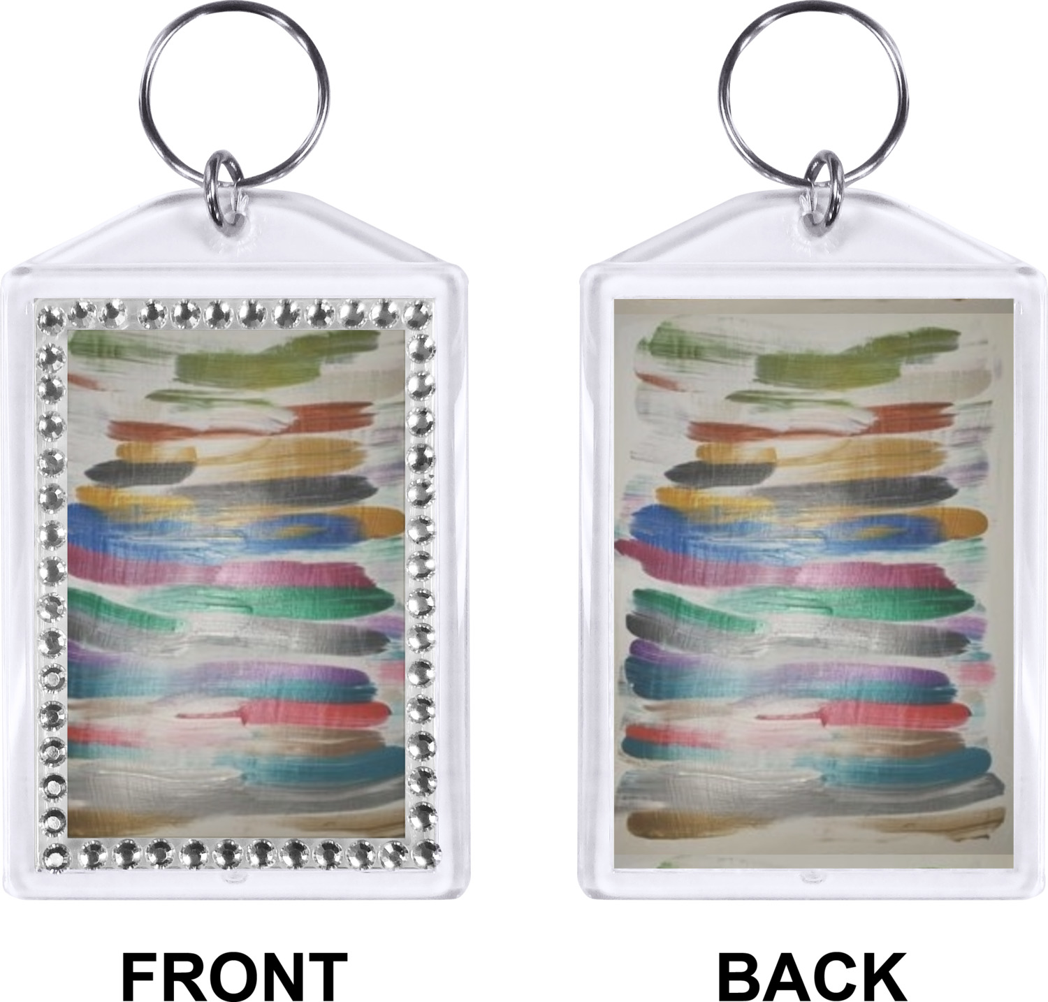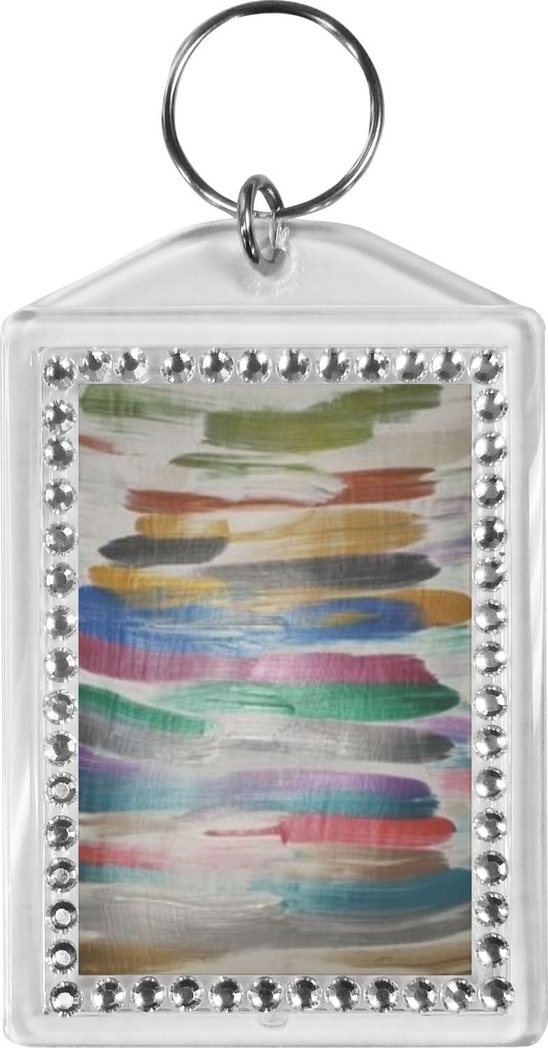 Our personalized keychains have a bold, rectangular shape, outlined by a series of shimmering rhinestones. A metal, split keyring is included with your purchase, and an additional metal hoop allows for attachment of the keychain to the split ring. This unique keychain measures at about 3.75 by 2.5 inches. We print your customized design(s) across both the back and front of this keychain.
